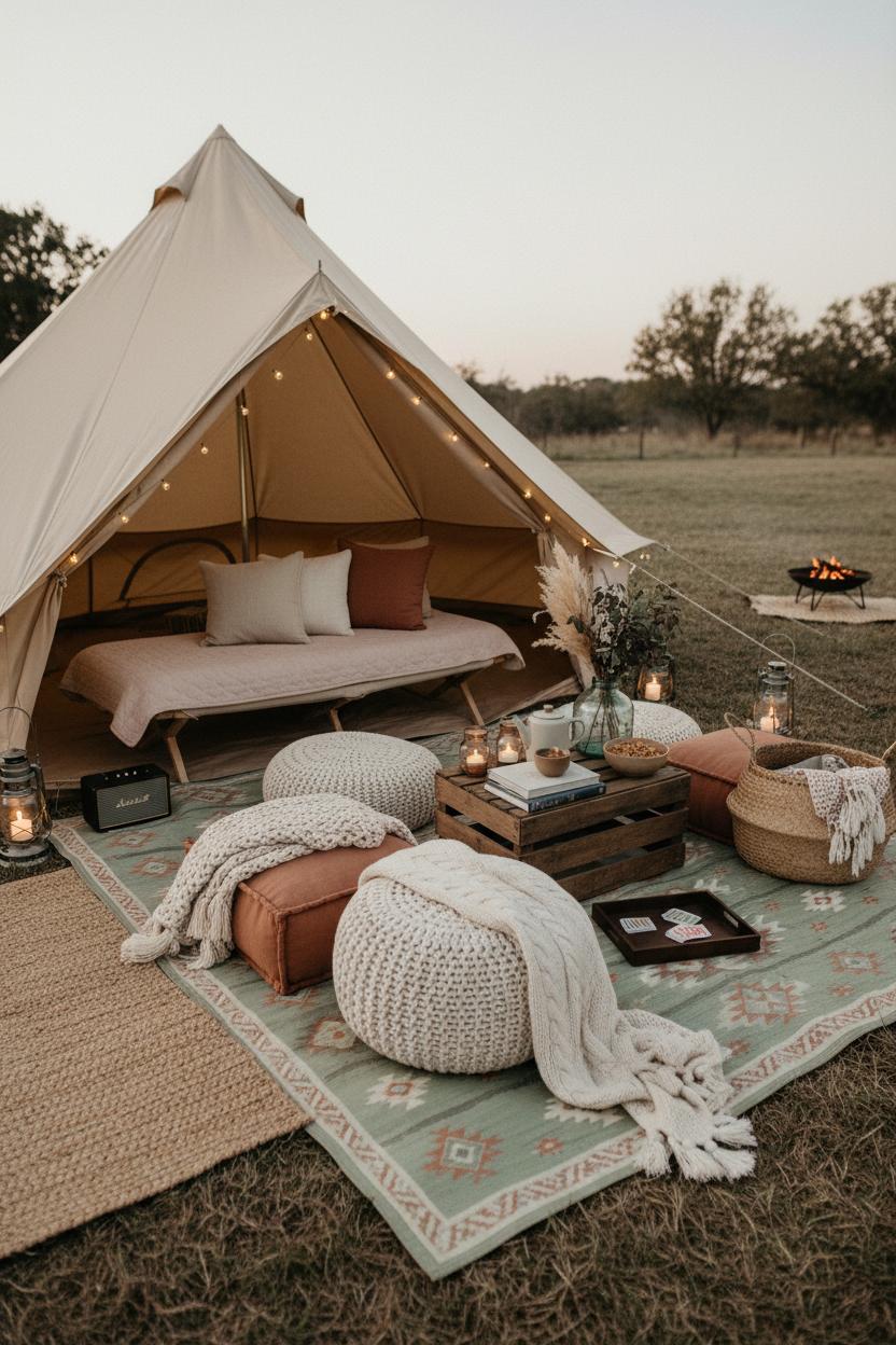 Start by rolling out a generous outdoor rug to define your lounge zone—it instantly makes dirt or grass feel intentional and cozy, and it sets the color palette for everything else. Layer on a few low-slung poufs and oversized floor cushions so guests can sink in, then drape throws everywhere: over the seating, tucked into a basket, and folded at the edge of a camping cot that doubles as a chic daybed. If you’re inside a canvas bell tent, this simple mix reads like curated tent decor rather than a campsite, especially when you add a small wooden crate or vintage trunk as a coffee table for books, tea, and late-night snacks. Drape solar string lights along the ridgeline and around the entrance so the whole space glows at dusk, and bring in a couple of lanterns for that warm, flickering layer. One of my favorite glamping ideas is to mix textures—chunky knits, soft linen, and a boho-patterned kilim—so your lounge feels plush and photo-ready without trying too hard.