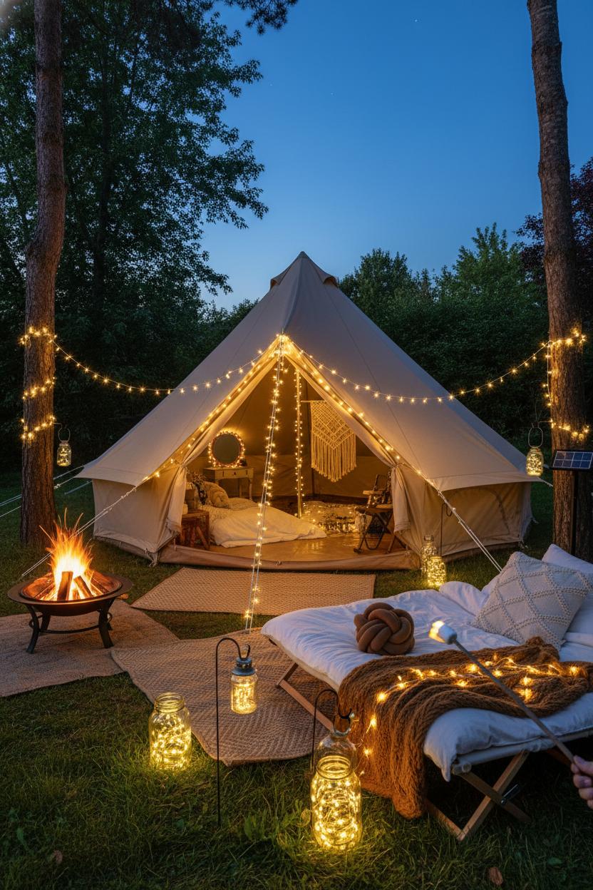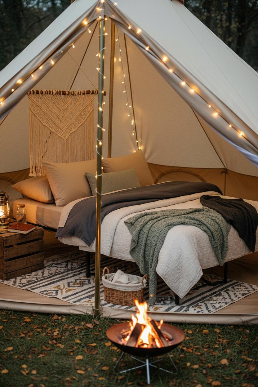 Layer the glow with tactile comforts so the lights feel intentional, not just festive. Roll out an outdoor rug to ground the space, then top a camping cot with plush bedding and a knotted throw so the light dances across textures. Add a portable fire pit a safe distance from the tent for flickering ambience and marshmallow moments—its ember-like glow pairs beautifully with the soft sparkle overhead. Inside, string mini lights around a vanity mirror or along a macramé wall hanging to turn practical pieces into polished tent decor. Keep cords tidy with small clips, and remember to angle solar panels south and away from shade for a longer evening shine. When you’re ready to stargaze for real, dim the twinkle and step outside—the contrast makes the night sky feel even more cinematic. Among all the glamping ideas you’ll try, this one delivers the biggest mood shift with the smallest lift, transforming any nook—forest hideaway or suburban patio—into a luminous little world.