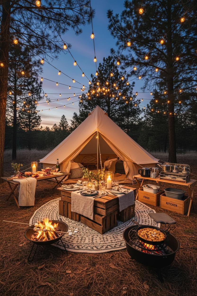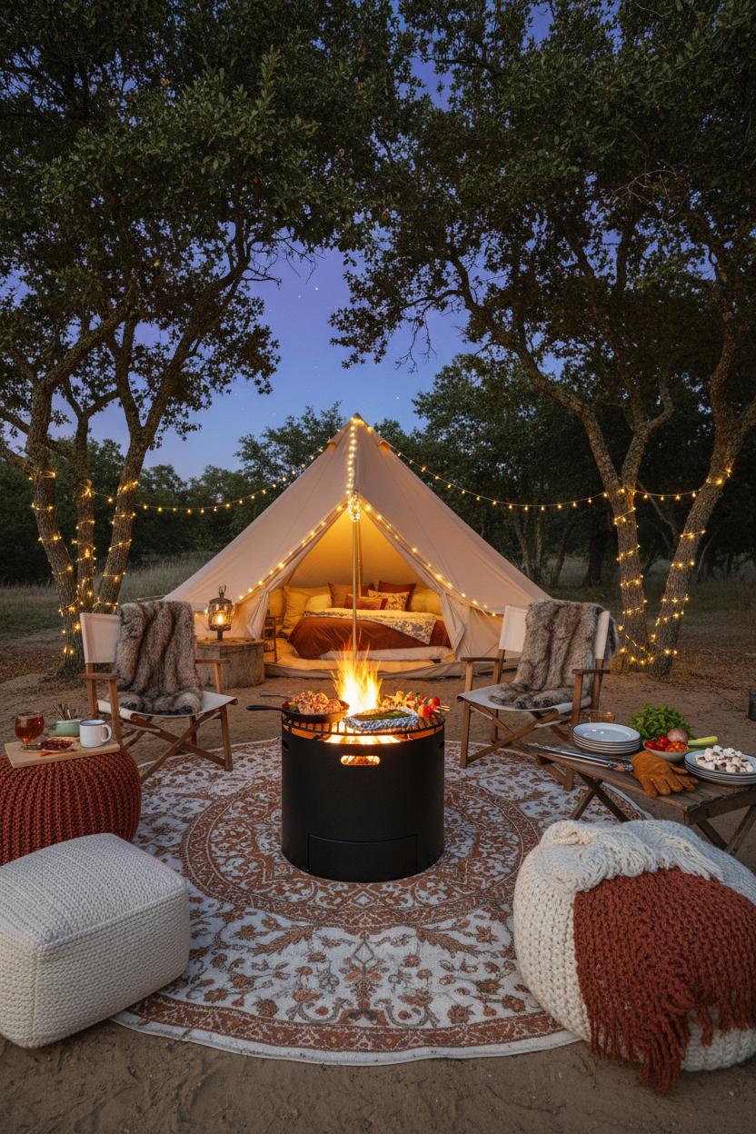 There’s nothing like the golden glow of a smokeless portable fire pit to turn a cool evening into pure cozy magic. Make it the heart of your camp setup and you’ll have instant ambiance and effortless warmth without the smoky haze clinging to hair and blankets. Set the fire pit on a level, nonflammable surface, then frame the scene with an outdoor rug to define the lounge zone and invite bare feet. Layer in low chairs, poufs, and throw blankets, and let your tent decor tie it all together—think a canvas bell tent twinkling under solar string lights stretched to nearby branches. Whether you’re planning upscale glamping ideas in the woods or sweet backyard glamping at home, this little hub becomes your living room under the stars, serving serious luxury camping vibes with minimal fuss.