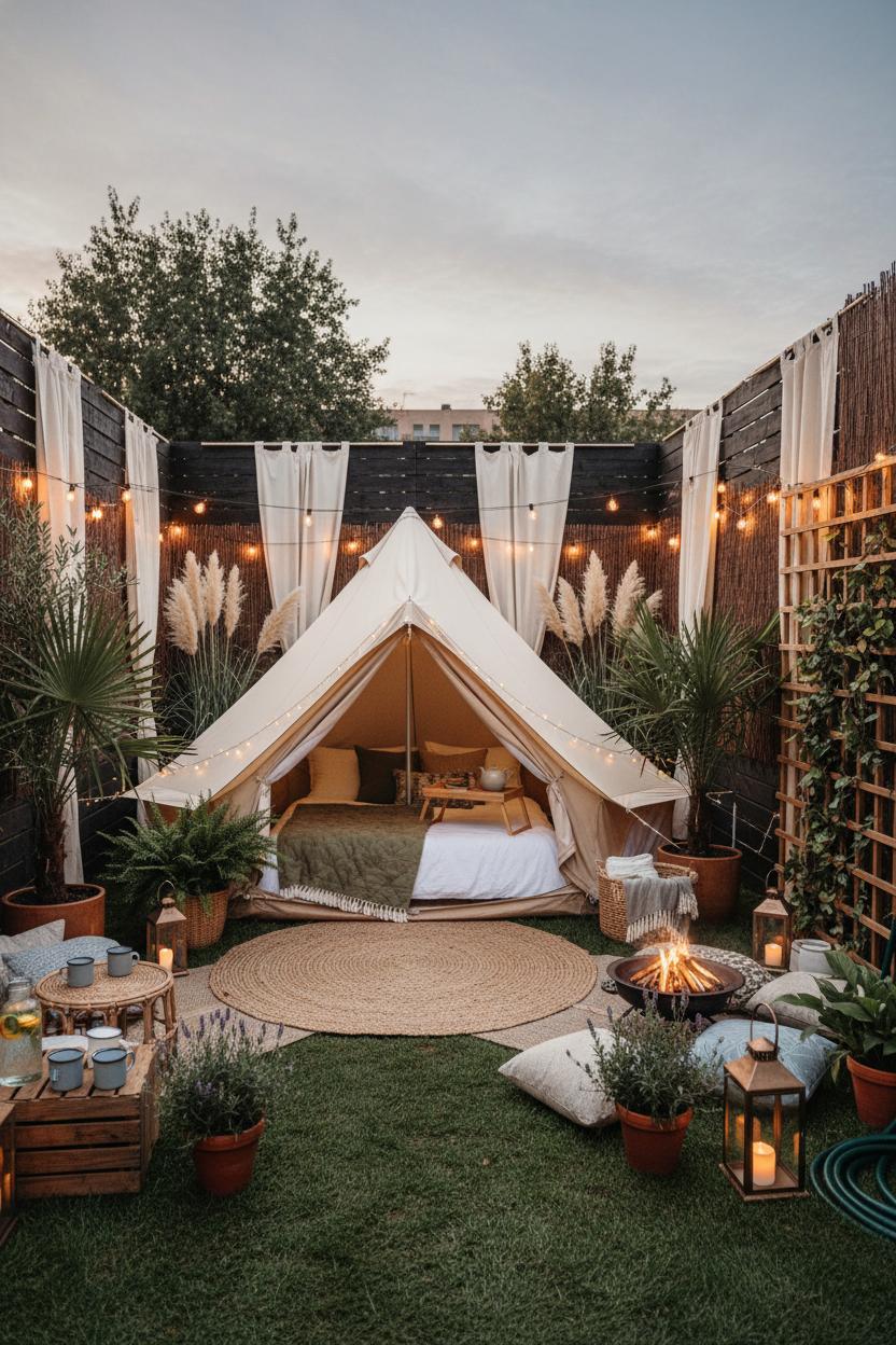 Carve out a cocoon of calm by wrapping your backyard glamping nook in layers of privacy and plants. Start with screens—slatted wood panels, reed fencing, or a simple run of outdoor curtains on tension rods—to blur sightlines and soften city edges. Let greenery do the rest: tall grasses to rustle in the breeze, potted olives or palms to anchor corners, ferns at the tent entrance, and trailing ivy up a lattice for that secret-garden vibe. A canvas bell tent instantly sets a luxury camping tone, and a textured outdoor rug at the door helps define the threshold from lawn to lounge. Inside, think elevated tent decor: gauzy canopy layers, linen pillows, a knit throw, and a tray for bedtime tea. As the sun sets, weave solar string lights along the screens and over the ridge line so the whole space glows like fireflies—soft, flattering, and effortless. Add a few lanterns on the path so midnight stargazing feels like its own tiny pilgrimage.
