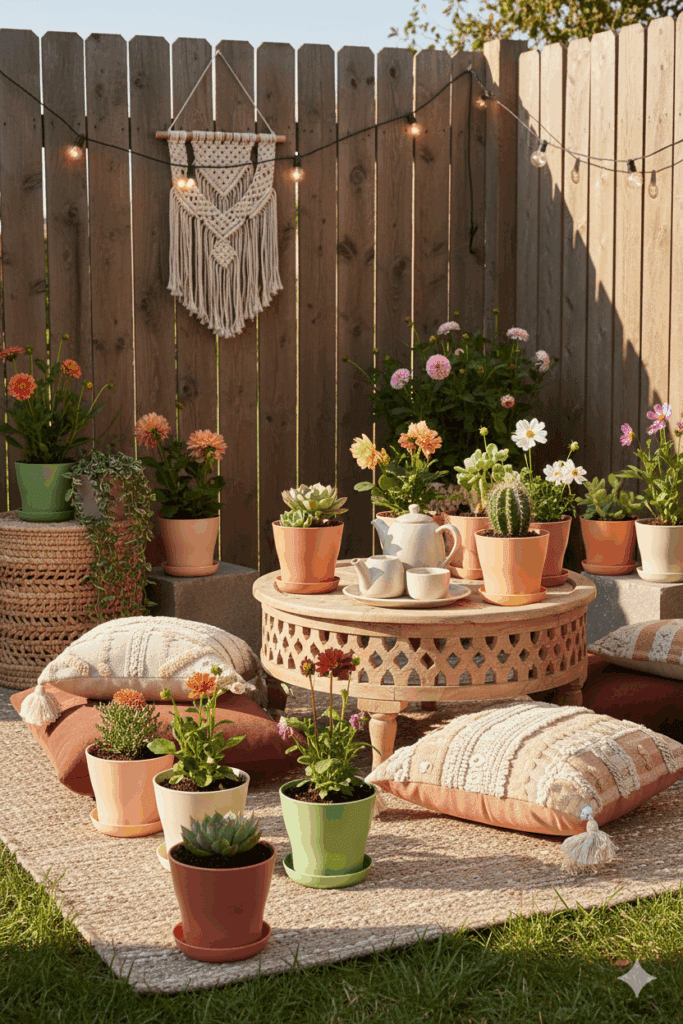 One of the easiest ways to tie everything together is by using matching outdoor string lights or coordinated soft furnishings. A set of sage green cushions, paired with light wood planters and warm white string lights, can instantly create a tranquil, spa-like atmosphere. Or go bold with jewel tones—deep teal planters, magenta flowers, and gold accents—for a dramatic boho-chic look.