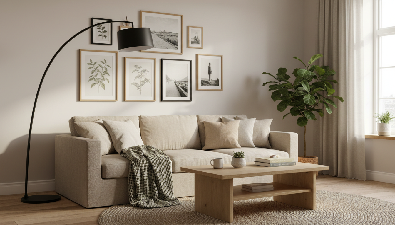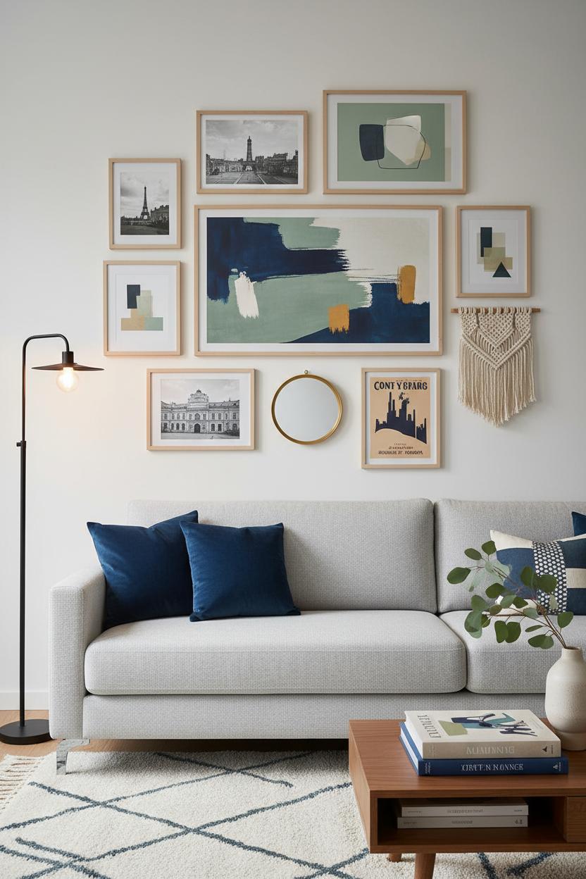 Finish with glow and texture: a slender floor lamp aimed at the display adds warmth and draws attention at night, while a soft area rug underfoot and a styled coffee table echo the tones of your art for a cohesive, cozy living room moment. If color scares you, pull a single accent from your favorite print and repeat it subtly in throw pillows or a vase. Whether you’re starting from scratch or refreshing what you own, a personality-packed gallery wall is one of those living room decor ideas that always wows—and evolves with you.
