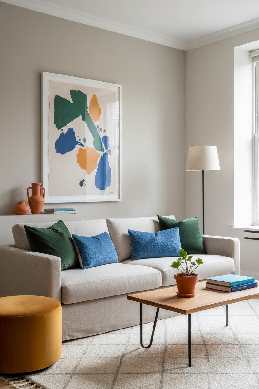 This approach is especially friendly to a small living room because it uses light neutrals to reflect brightness and saves the drama for accents that don’t visually crowd the space. Swap a bulky side table for a slender floor lamp to draw the eye upward, and consider a glass or leggy coffee table to keep sightlines open. If you’re craving a cozy living room, layer tonal neutrals—cream, mushroom, charcoal—then warm them up with cinnamon or forest green textiles and a patterned area rug underfoot. A few home styling tips to keep it cohesive: aim for the 60-30-10 rule (60% neutral, 30% supporting neutral, 10% bold), mix textures like boucle, linen, and matte metal so the palette feels rich even when the colors are quiet, and style in odd numbers for an effortless look. When you’re ready for a refresh, swap pillow covers, rotate in new wall art, or trade your accent color seasonally—cobalt for summer, rust for fall—while your neutral backbone stays beautifully grounded. These living room decor ideas make it easy to edit and evolve without starting from scratch, so your space always feels current, personal, and endlessly welcoming.