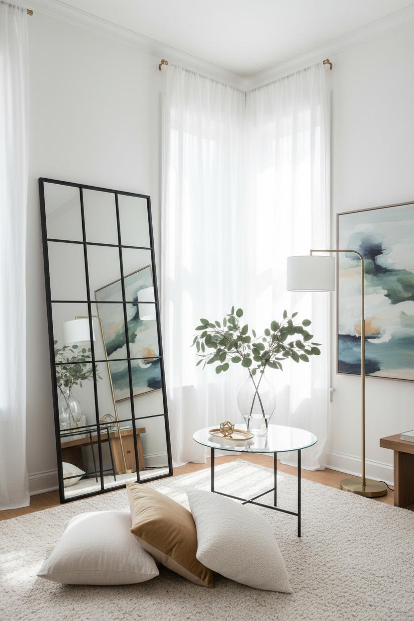 Keep the rest of the styling quiet and light so your new brightness really sings. Choose a pale area rug that reflects rather than absorbs light, then warm it up with tactile throw pillows in linen, boucle, or velvet so the room feels inviting, not washed out. A glass or slim-legged coffee table reduces visual weight, while a wood top adds organic warmth; mix in a few metallic accents to echo the mirror’s gleam. For balanced walls, offset your mirror with a single large-scale wall art piece so the room feels anchored, not busy—think soothing abstract strokes or a serene landscape that pulls your palette together. A few leafy branches in a clear vase catch and refract the light beautifully, and it’s one of those easy home styling tips you’ll use again and again. These simple living room decor ideas don’t require a remodel, just smart placement and airy layers—and they’ll make even the most compact corner feel open and refreshed, turning your everyday lounge into a sun-kissed haven you’ll love from morning coffee to movie night.