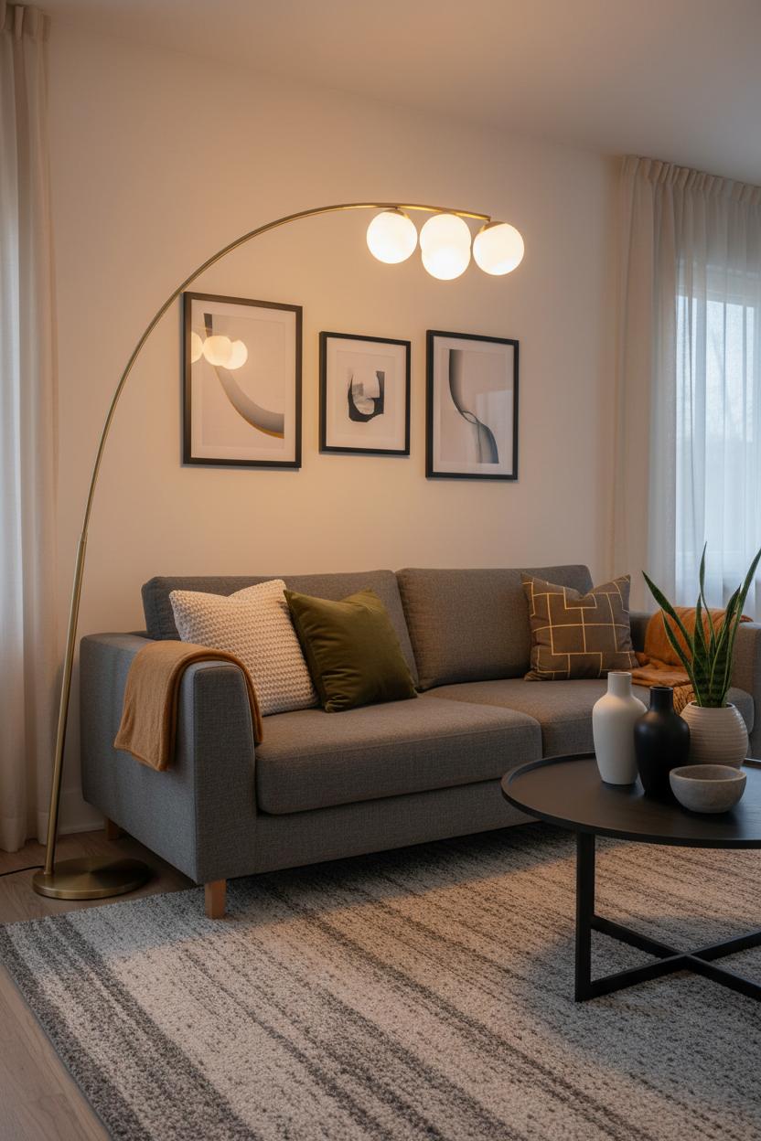 Style the scene to make the lamp sing. Ground the nook with an area rug that picks up the lamp’s metal tone, layer in textured throw pillows, and hang wall art that subtly echoes its curve or finish for a pulled-together look. Keep scale in check: the shade should clear the back of the sofa without overwhelming it, especially in a small living room where negative space is your best friend. A few quick home styling tips to finish: group accents in odd numbers on the coffee table, mix matte and glossy surfaces for depth, and add a plant or stone bowl to soften the lines. The result is a warm, sculpted glow that makes even the most pared-back modern living room feel considered—and irresistibly inviting.