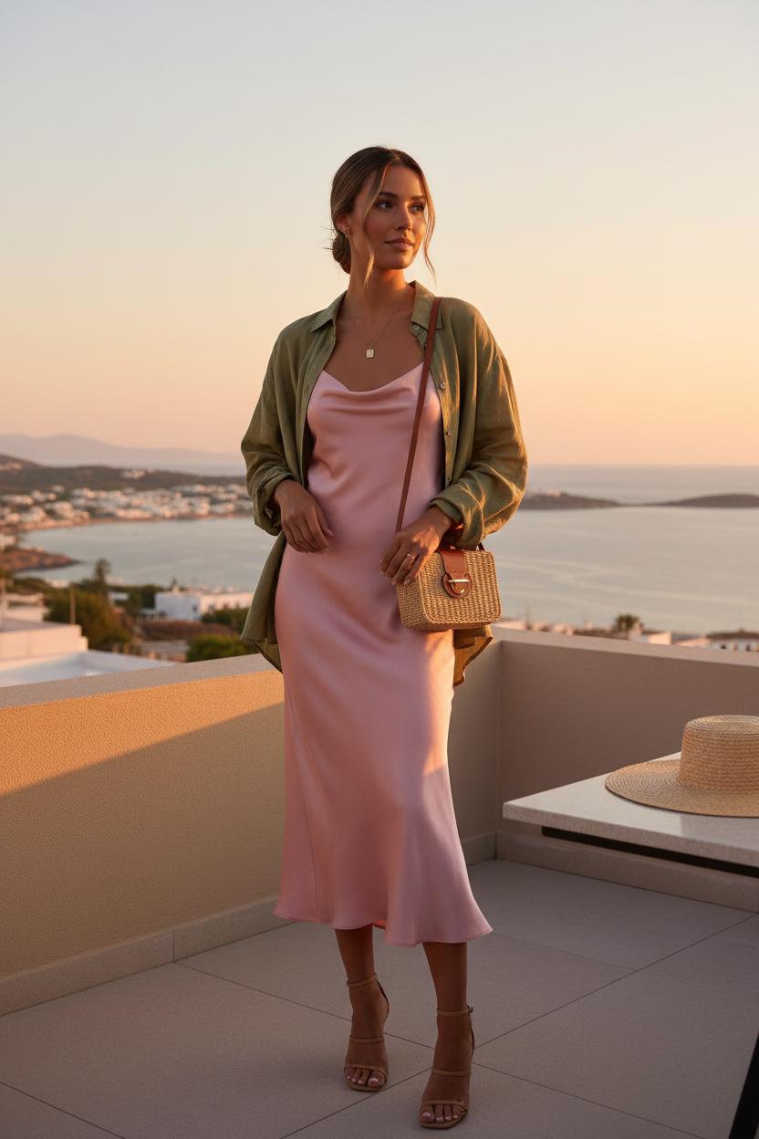 Keep the styling minimal and sun-kissed. Slip on barely-there heels—think strappy sandals women that elongate the leg without competing with the dress—and let texture do the talking with a raffia crossbody bag that adds a coastal, undone touch. A delicate pendant, glossy lip, and soft bun make it all feel intentional yet easy. If the evening breeze picks up, shrug on an oversized linen button-down; if you packed a linen set women for daytime exploring, borrow the shirt as a breezy layer over your slip. A straw hat looks chic for the twilight walk to dinner, then tucks into your bag when the stars come out. Opt for sun-washed hues (saffron, shell pink, olive) or anchor everything in timeless neutrals so pieces mix and match with zero effort.