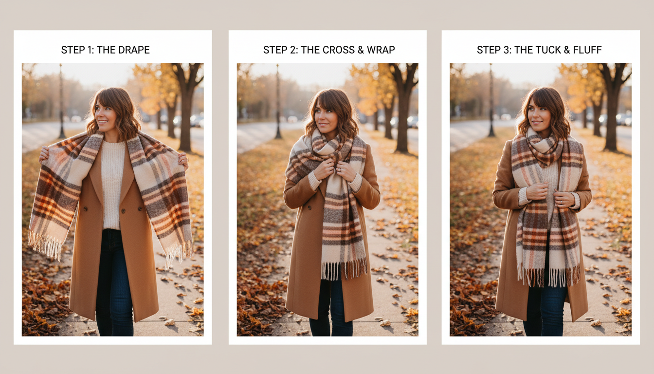 When the forecast flips to flurries, I reach for the coziest of blanket scarf styles and start with the hooded wrap—equal parts practical and storybook charming. Take a square blanket scarf or any oversized scarf and fold it into a triangle. Set the long edge gently over your head like a soft hood, then cross the two points over your chest and wrap them around your neck once or twice, letting the ends fall forward. Tuck and fluff so the “hood” frames your face and the layers sit plush and high—snug enough to block wind, but loose enough to breathe. If it’s blustery, slide a scarf ring just under your chin to secure everything without the bulk of a knot, or try a couple of discreet scarf knots at the ends and hide them in the layers. A cashmere scarf turns this into cloud-soft armor; a classic blanket scarf adds that satisfyingly woolly texture. Style tip: echo the triangle’s lines with a peaked beanie or a faux-fur-trimmed parka. It’s one of those winter accessories that photographs beautifully and feels even better in real life.
