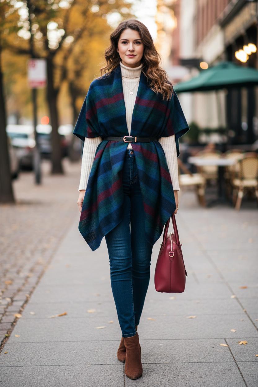 Fabric and finish make all the difference. A lush cashmere scarf melts around your frame for a refined, office-friendly take, while a chunky blanket scarf brings cozy volume for weekends and tailgates. If your belt feels bulky, pre-secure the ends with a discreet scarf ring, then belt—everything stays put without fuss. Play with color and pattern: a tonal plaid elongates, narrow stripes sharpen, and a deep jewel tone grounds florals beneath. Petite? Let the front points hit mid-thigh and choose a slim belt. Curvy? Opt for a medium belt at the natural waist and a fluid drape. Tall? Drop the belt slightly for a nonchalant, runway feel. If you’re shopping online, search terms like large scarf women, blanket scarf, oversized scarf, and cashmere scarf will surface pieces with the right size and swing for this look. Among all blanket scarf styles, the belted poncho wrap is the ultimate multitasker—cinched, sleek, and universally flattering for coffee runs, commutes, and everything in between.