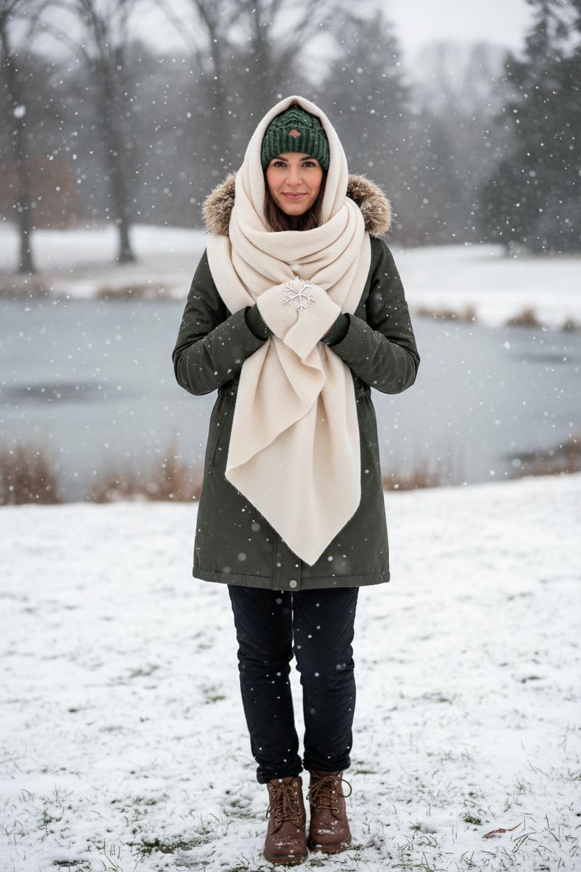 For the hand-warmer drape, think modern muff. Drape your large scarf across your shoulders like a cape, bringing the ends forward. Tie two loose scarf knots at hip level to form soft loops, then slide your hands into those loops as you walk—instant pockets. Alternatively, wrap once around your neck, let the tails hang long, and fold each tail back on itself to make a plush pouch; secure with a scarf ring or a tiny hidden stitch if you’re out all day. This keeps fingers toasty while showing off the sweep of the fabric—cute with a quilted jacket and lug boots, or layered over a sweater dress if you’re collecting fall outfit ideas to carry into snowy months. For shopping, search terms like “large scarf women,” “blanket scarf,” “oversized scarf,” or “cashmere scarf” will surface great options in every palette. However you approach your large scarf tying, these snow-day moves balance warmth and drama—proof that your coziest layers can double as finishing touches and functional fashion.