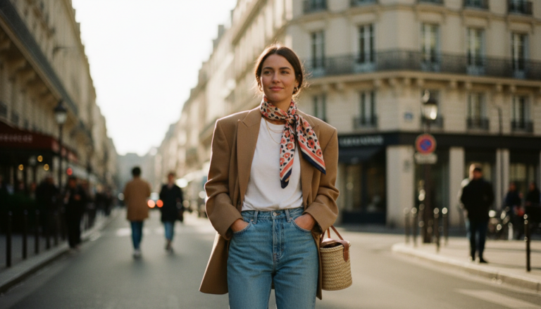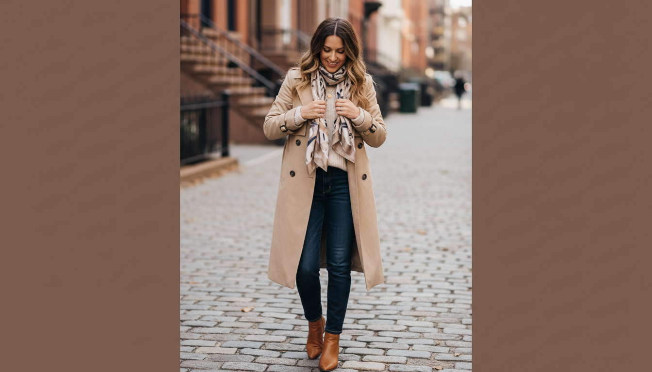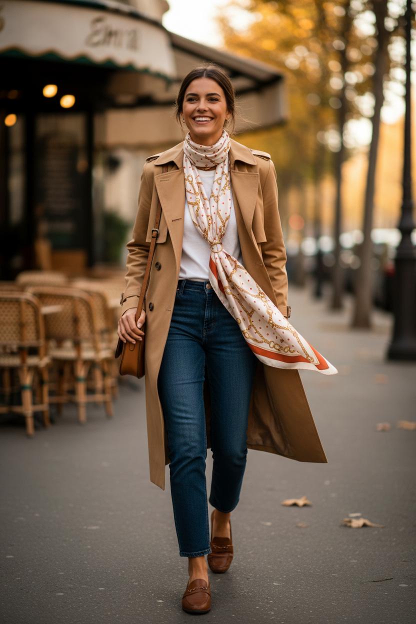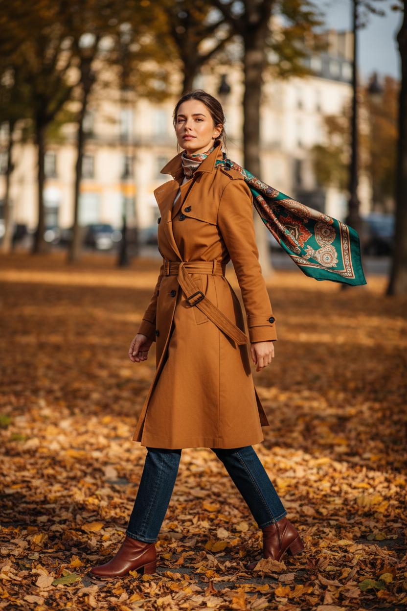 There’s something irresistibly French-girl about tossing a silk scarf over one shoulder and letting it skim the lapel of a trench coat as you walk through crisp leaves. This shoulder-tie trick is one of my favorite fall fashion tips because it feels effortless yet polished—like you just shrugged on confidence with your outerwear. It’s scarf styling with intention: the scarf becomes an elegant accent line that draws the eye up toward your face, softens the structure of a classic trench, and adds a hit of color or print right where your outfit needs it.