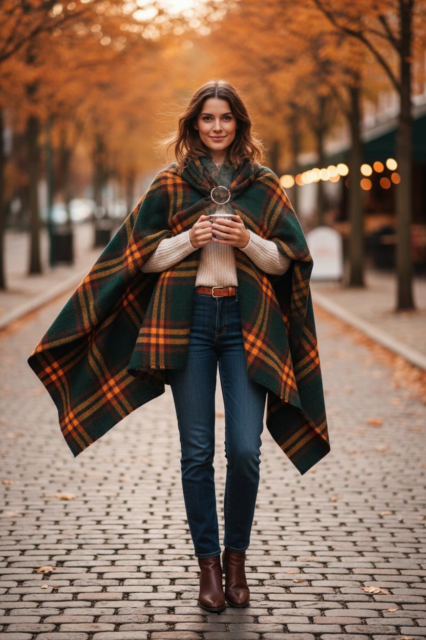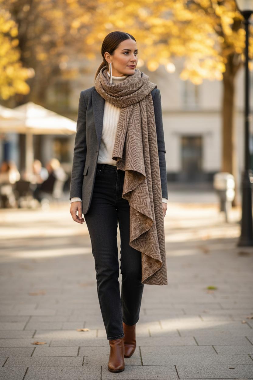 When the air turns crisp and the leaves go copper, I reach for an oversized blanket scarf and do the Cape Drape—an instant way to look pulled-together while feeling like you never left your couch. Think of it as the cozy cousin to a blazer: soft, swingy, and unexpectedly polished. For fall fashion tips that actually keep you warm, this is top of the list. Choose a plush wool scarf or a cashmere blend in a rich plaid or herringbone; the weight gives you that dramatic swish. If your day starts chilly and ends mild, the Cape Drape layers beautifully over a simple knit or even a classic trench coat, transforming everyday basics into Pinterest-worthy scarf outfit ideas with zero fuss.