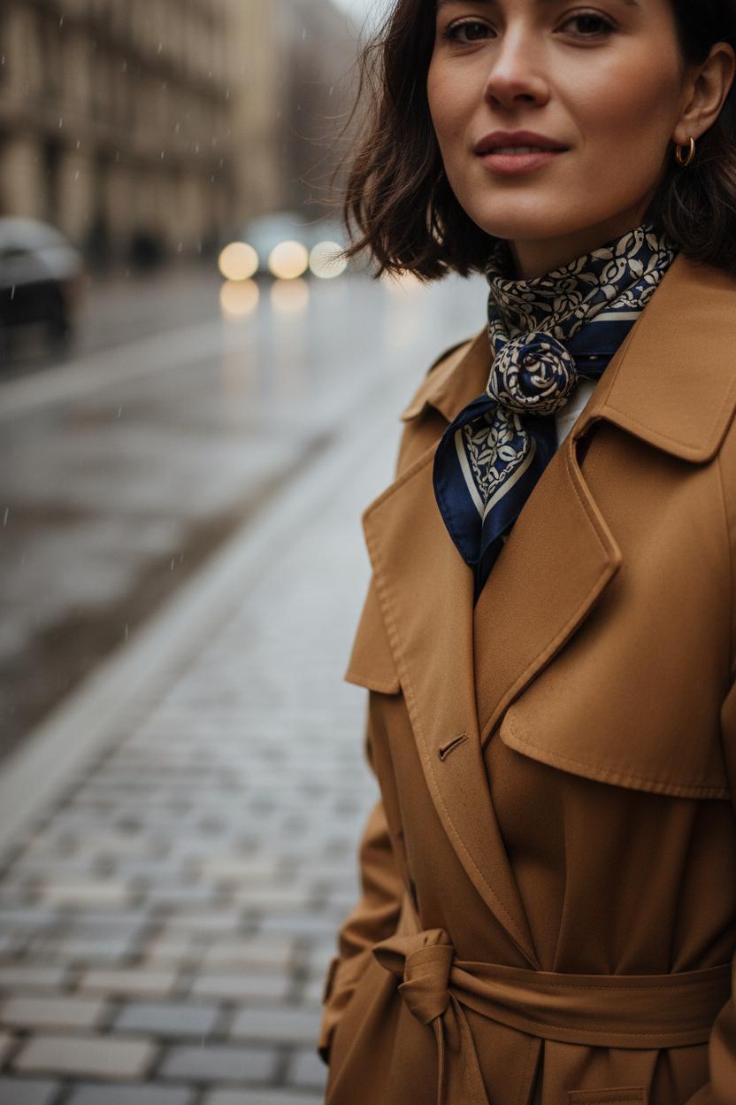 For scarf outfit ideas, pair a caramel trench coat with a jewel-toned print—emerald, rust, or burgundy—to warm up denim and ankle boots. A navy trench loves a graphic black-and-ivory pattern; camel looks rich with a silk scarf in autumn florals. If you want a cozier variation, swap in a featherweight wool scarf and mimic the same shoulder tie, or go dramatic on weekends with an oversized blanket scarf styled over one shoulder and belted. No matter the fabric, this simple shoulder knot proves that small details can transform your layers—and that’s the heart of smart fall scarf styling.