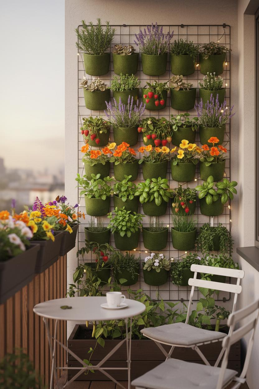 A few setup tips keep container gardening effortless. Choose a planter with built-in reservoirs or use felt pockets lined with plastic backing to protect walls, and anchor heavier pieces securely. Group plants by sunlight and thirst: leafy greens and basil in shadier lower rows, peppers and rosemary up high where it’s brightest. Water from the top so gravity wicks moisture downward, or add a tiny drip line; vertical planters dry faster, so mix in coco coir or compost for better water retention and feed lightly every couple of weeks. If you’re working with a tiny backyard, flank the feature with railing planters along the deck for extra color and pollinator flowers, and tuck a small raised bed at the base for tomatoes or dwarf beans that can climb into the display. Leave just enough floor space for a compact bistro set so you can sip morning coffee surrounded by greens. Come evening, a strand of warm fairy lights and the scent of lavender will make your slim slice of outdoors feel like a secret garden—proof that even the tiniest space can bloom with a little vertical magic.