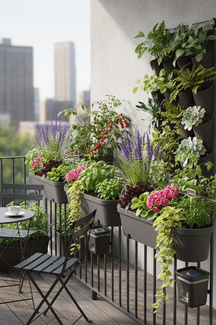 Imagine turning the edge of your balcony into a green runway—railing planters clip on like chic accessories and instantly double your growing space without stealing an inch of precious floor. They’re the ultimate balcony garden boosters: perfect for color, herbs, and even a few edibles, while leaving room for that compact bistro set where you sip morning coffee among the blooms. Start by measuring your railing and choosing sturdy, adjustable brackets or drop-over styles, then consider weight—moist soil is heavy, so go for lightweight potting mix and coco coir to keep things manageable. Add liners or drip trays if you have neighbors below, and look for UV-stable materials so your planters stay pretty season after season. This is container gardening at its smartest—one of those small garden ideas that feels both stylish and practical.