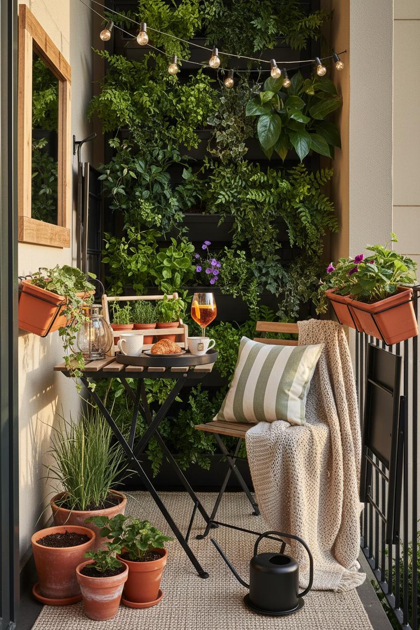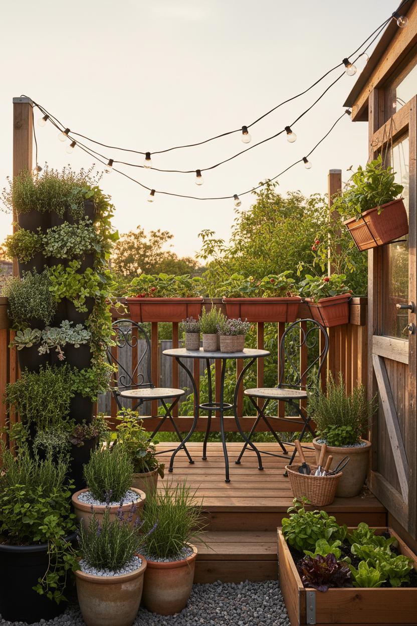 Greenery is the magic that makes the nook feel lush. Surround the seating with vertical gardening to save floor space: a slim vertical garden planter behind the chairs becomes a leafy backdrop and natural privacy screen. If you’re styling a balcony garden, clip on railing planters for trailing ivy and strawberries, and rely on container gardening in staggered pots to add height and texture around the table legs. For herbs at arm’s reach, set a petite herb garden kit right on the tabletop—brushing past basil and mint releases the best fragrance. In a tiny backyard, flank the area with a small raised bed filled with lettuces and edible flowers so dinner practically grows beside you. Consider a mirror on a fence to bounce light, and a wall hook to hang foldable chairs when not in use. Keep watering simple with saucers and a slim can stored under the table. Whether you’re carving out two feet on a stoop or a pocket patio off the kitchen, this little dining perch turns the smallest footprint into a daily pleasure—and proves that thoughtful, layered small garden ideas can make even the tiniest space feel like a private bistro.