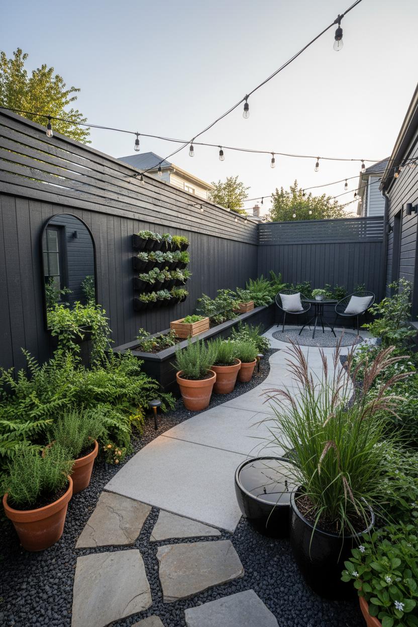 Think like a stage designer and your tiny backyard becomes a set with clever sightlines. Start by making boundaries recede: paint fences a deep charcoal so greenery pops and the edges visually melt away, then add horizontal slats or slim battens to “stretch” the space. Lay pavers on a gentle diagonal to pull the eye outward, and curve a simple stepping-stone path toward a corner focal point—a tall grass or citrus in a handsome pot—so the destination feels farther than it is. Reflect light and sky with a shallow water bowl or a weatherproof mirror angled to catch plants rather than direct sun; that shimmer adds depth without feeling gimmicky. Height is your best illusionist, too: embrace vertical gardening with a slim vertical garden planter against the wall and string lights overhead to lift the gaze.