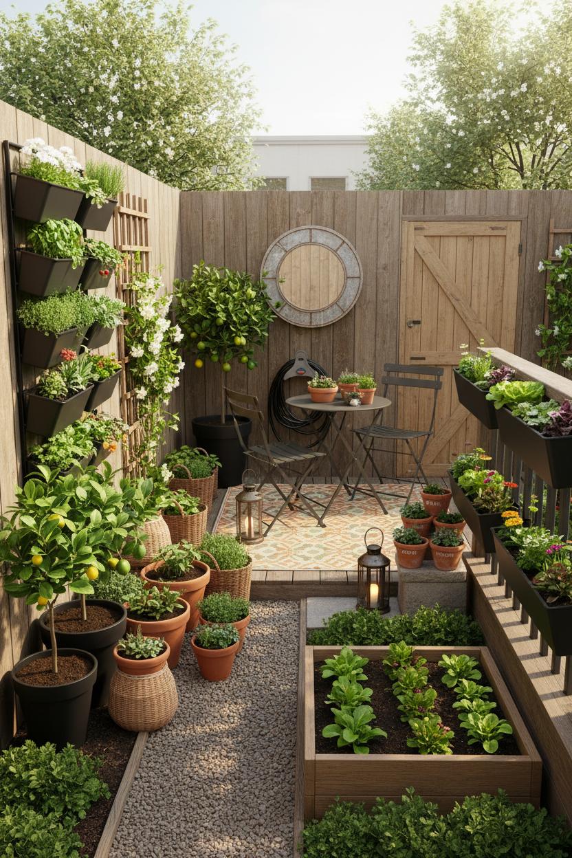 Borrow tricks from a balcony garden by repeating materials and colors so the space looks cohesive rather than crowded—terracotta tones, matte black metal, or woven baskets all play nicely together. Add a compact bistro set that folds when you need more room; it doubles as your morning coffee nook and an evening wine perch without overpowering the view. Soften the verticals with a climbing jasmine or a clematis on a simple trellis, and tuck dwarf citrus or a patio tomato into a large pot for that just-picked magic. A narrow outdoor rug and a few lanterns anchor the seating zone, while a mirror hung on the fence makes the garden feel deeper than it is. Watering stays simple with a coiled hose and a timer on a drip line, and seasonal swaps keep the look fresh: spring pansies give way to summer zinnias, then fall kale and pansies return. With a few clever layers and thoughtful edits, your tiny backyard becomes a lush little haven that works hard and looks dreamy.