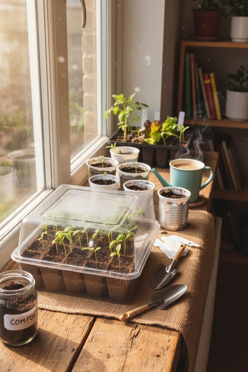 You don’t need a fancy setup, either. Pair the seed starter kit with a few cheap garden tools (a simple trowel, labels, and a spoon or pencil for dibbling) and a gentle watering can so you don’t wash tiny seeds away. When seedlings graduate, tuck them into saved yogurt cups or repurposed tins as DIY planters, then up-pot into simple planter pots when they’ve grown. If you’ve got a compost bin, sift the finished compost fine and mix a small amount into seedling potting mix when you pot up; it adds nutrients without overwhelming baby roots. These small garden ideas make a big difference when space and budget are tight—stackable trays on a bookshelf, a bright kitchen ledge, or a balcony rail can turn into a mini nursery in days.