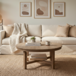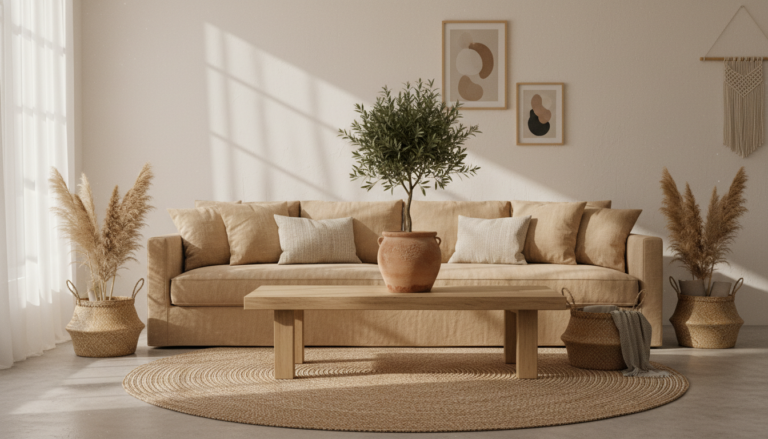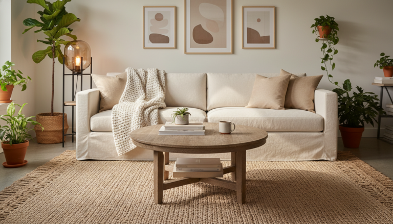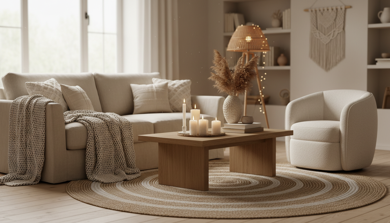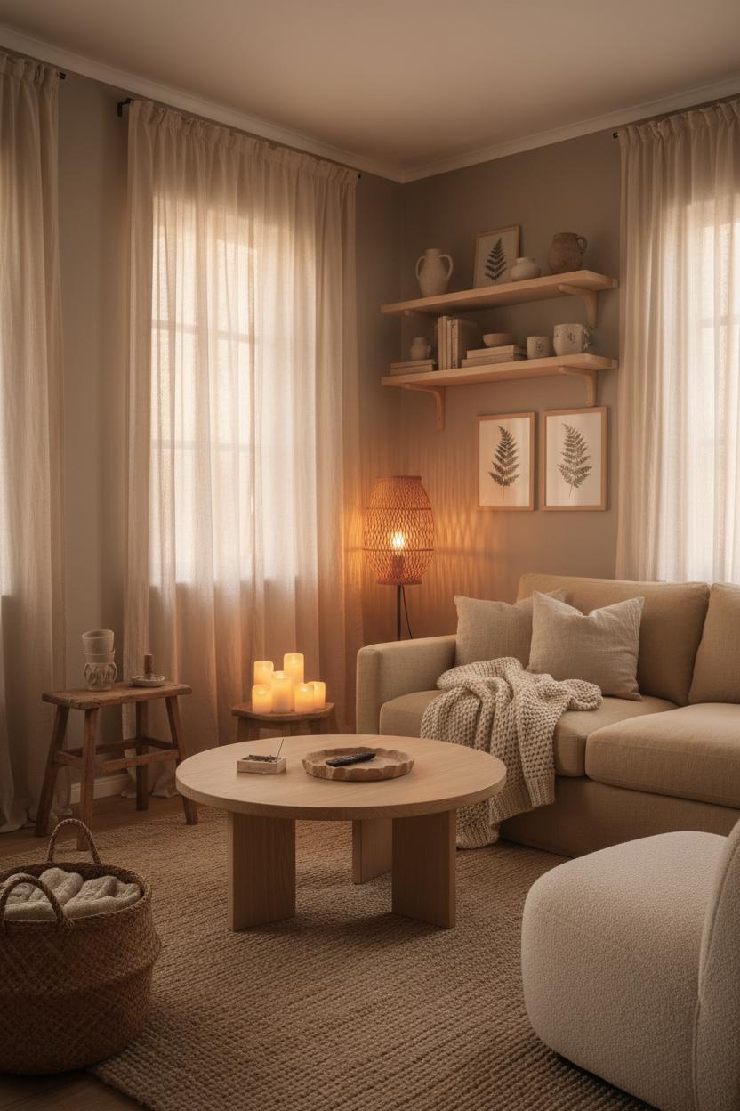 Lean into the calming comfort of nature by letting wood, linen, and handcrafted details take center stage. Hygge home decor thrives on textures that feel honest and lived-in, so start with a base of pale oak or walnut—think a low wood coffee table with softly rounded edges, floating shelves that showcase pottery and well-loved books, or a vintage stool repurposed as a side table. Drape windows in washed linen so they gather light like a soft fog, and keep the palette grounded in oatmeal, mushroom, and warm sand for that effortless neutral living room vibe. Layer a jute area rug underfoot for a mellow, beachy texture, and trade harsh overheads for warm pools of light—a rattan floor lamp or a clustered flameless candles set will glow like embers and instantly signal slow-evening mode. These are the quietly luxurious touches that make warm living room decor feel cocooning without ever feeling cluttered.
