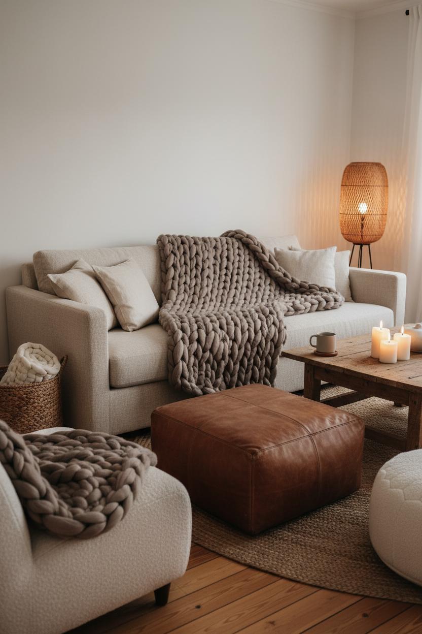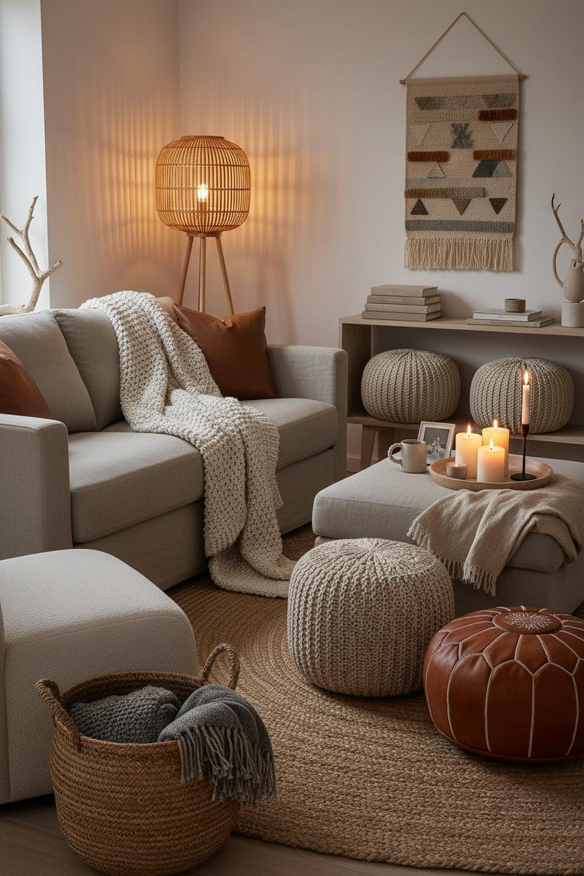 Warm Living Room Decor with Soft Throws, Poufs, and Tactile Accessories