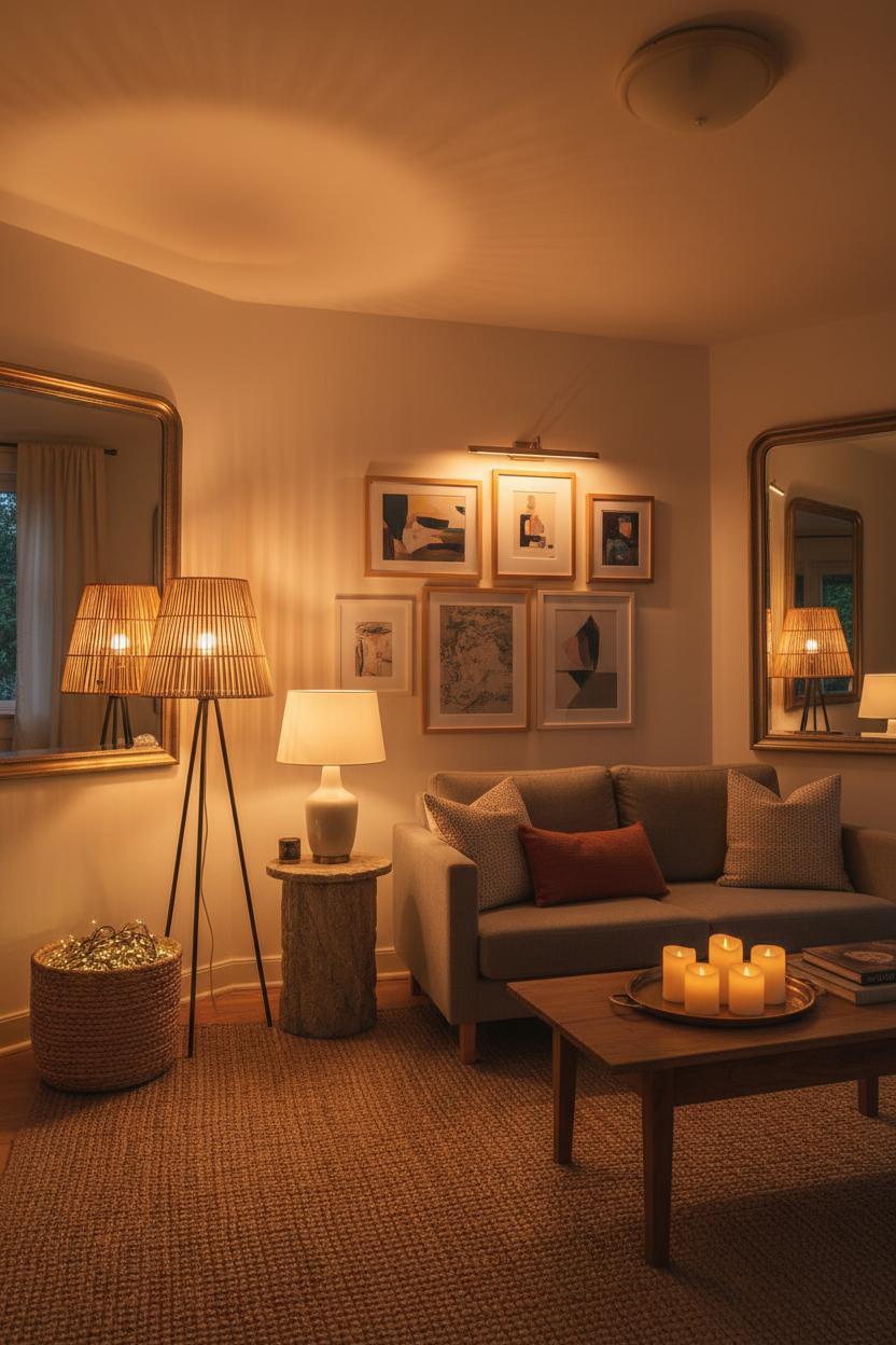 The secret is warmth and variability. Choose bulbs in the 2200–2700K range, add dimmers if you can, and let your lights whisper rather than shout. A flameless candles set brings that flicker without worry, letting you cluster a trio on the mantel or in a tray on the coffee table for a soft, layered glow. Mirrors and metallic accents bounce light back into the room; a brass-framed mirror angled toward your rattan floor lamp doubles the ambiance with almost no effort. If you love a neutral living room, this approach keeps things interesting after dark—the interplay of shadows and highlights adds movement to calm palettes so your warm living room decor never reads flat.