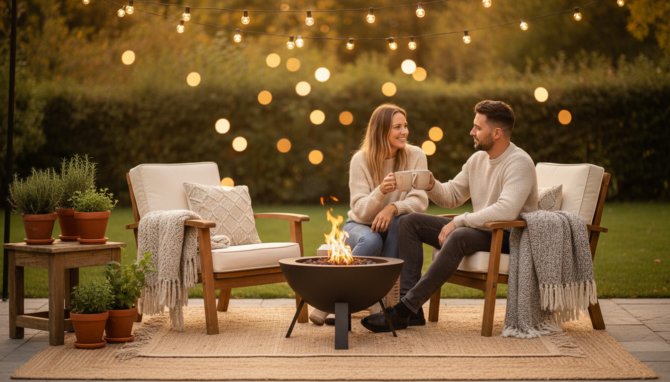 To turn this setup into the coziest corner of your yard, go all in on outdoor lighting. Drape warm white string lights overhead or zigzag them along a fence line for that golden-hour sparkle long after sunset. A couple of lanterns at varying heights add depth, while the flicker of the tabletop flame becomes the star. For texture, mix in a woven basket with blankets and a stack of lightweight throws—these weather-friendly layers make even a breezy night feel snug. If you’re hosting, set out simple s’mores fixings or a charcuterie board; the fire’s soft crackle invites everyone to linger.