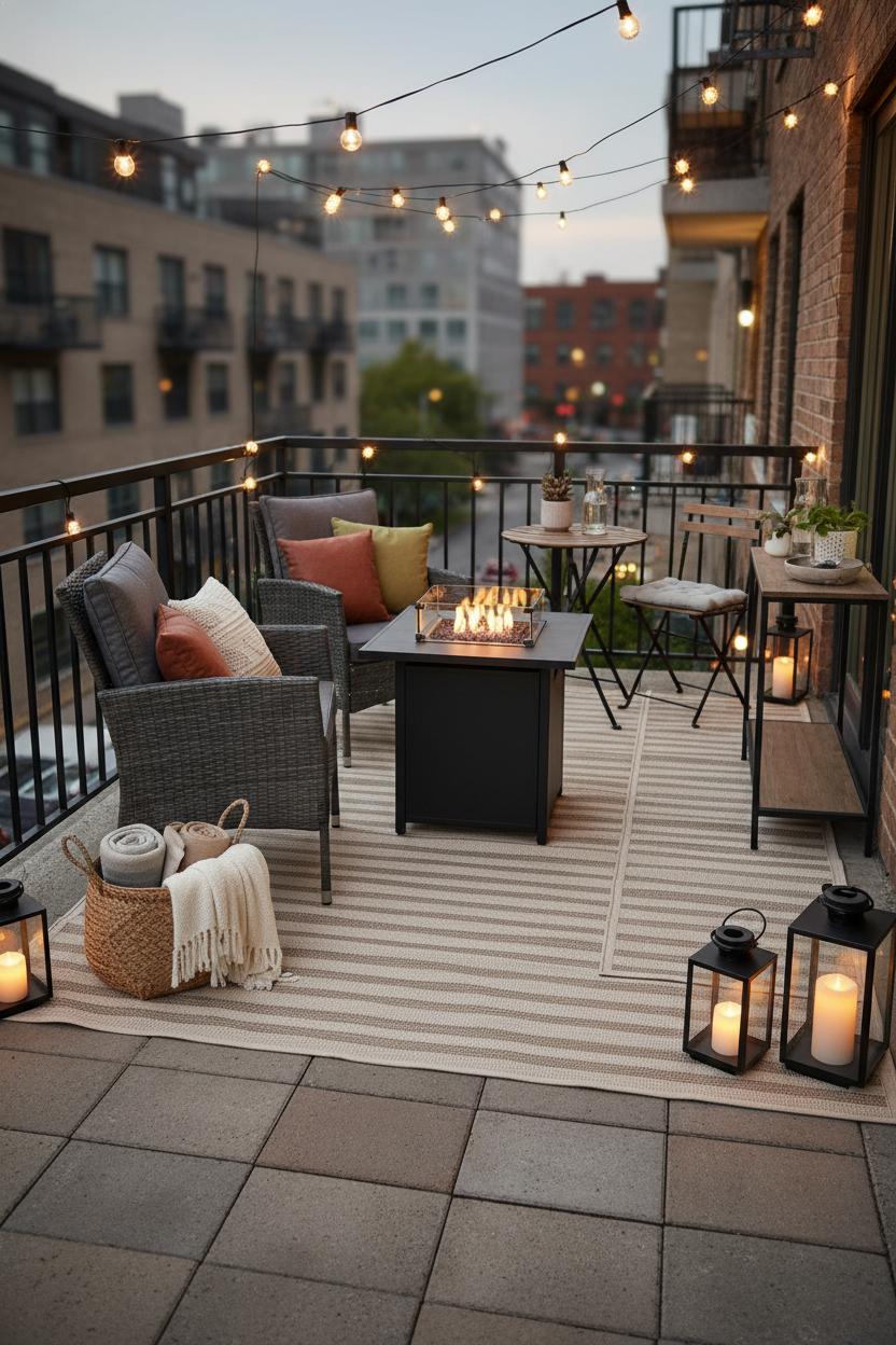 From there, style your rug-defined area into a lounge that doubles as fire pit seating. Pull in two comfy patio chairs and tuck a tabletop fire pit between them for that amber-glow moment without committing to a built-in pit—ideal for renter friendly decor. Sprinkle in weatherproof throw pillows for softness and color, and keep a basket of lightweight blankets nearby for breezy nights. If you’re carving out two mini zones, let the main outdoor rug anchor the lounge while a narrow runner under a bistro set nods to a tiny dining perch; leave a clear walkway so the layout feels intentional, not cramped. Diagonal rug placement can even make a pocket-sized patio read larger. Finally, layer outdoor lighting to add height and drama: drape string lights overhead for a starry canopy, then dot the perimeter with lanterns or solar stakes for a soft, flattering glow that guides the eye around your little oasis. Temporary adhesive hooks, foldable furniture, and portable pieces keep everything flexible for seasons—and leases—to come. With a few well-chosen accents and a hardworking rug, your small patio becomes a polished retreat that feels both pulled-together and wonderfully lived in.