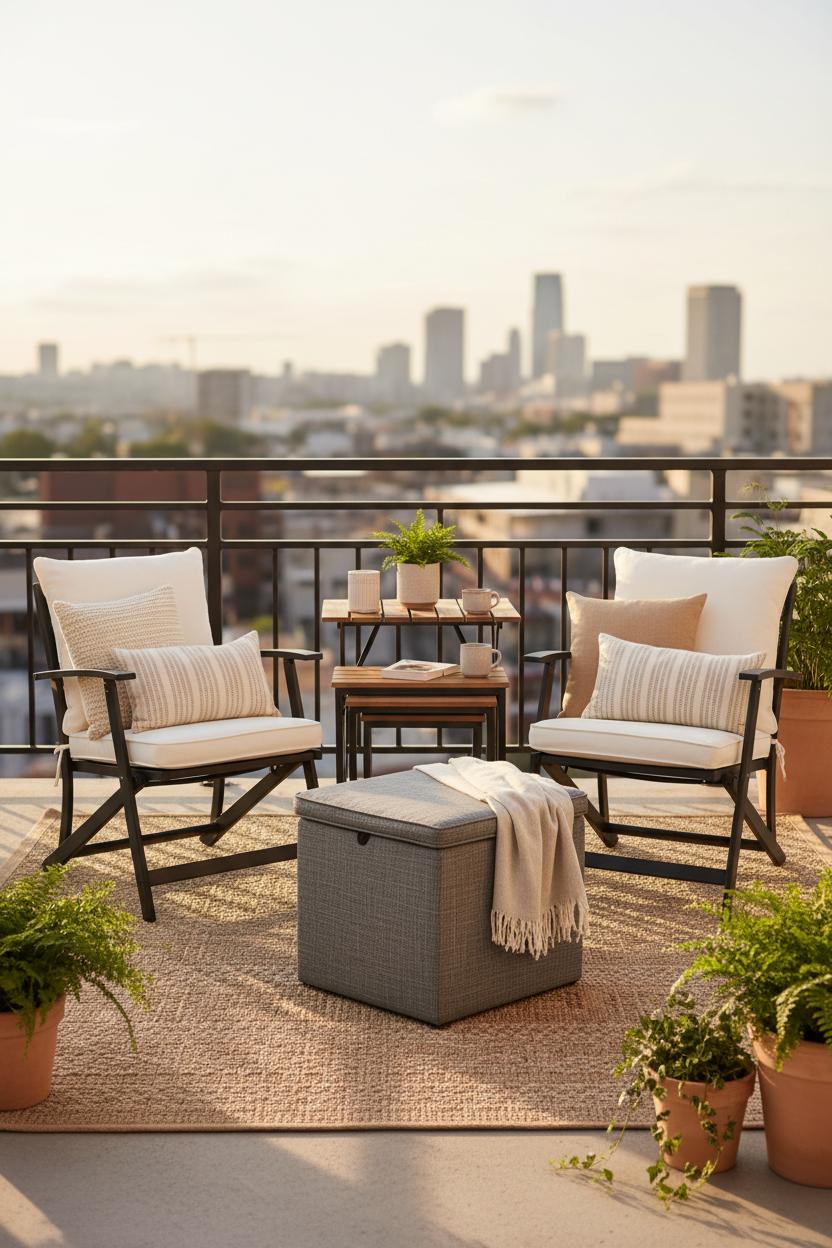 Define each nook with an outdoor rug so your layout reads as a “room,” even in a tiny courtyard or balcony. Pull the palette together with weatherproof throw pillows that share a color or two, even if your seating styles vary. Keep pieces lightweight and movable—folding patio chairs, stackable stools, and narrow nesting tables are MVPs—so you can pivot from solo reading to impromptu wine hour. If you’re seeking renter friendly decor, think reversible rugs, clip-on side tables, and cushion covers you can swap seasonally; they travel well and make any space feel layered fast. Don’t forget a basket or storage ottoman for blankets, citronella, and games so your nook is always ready to go.