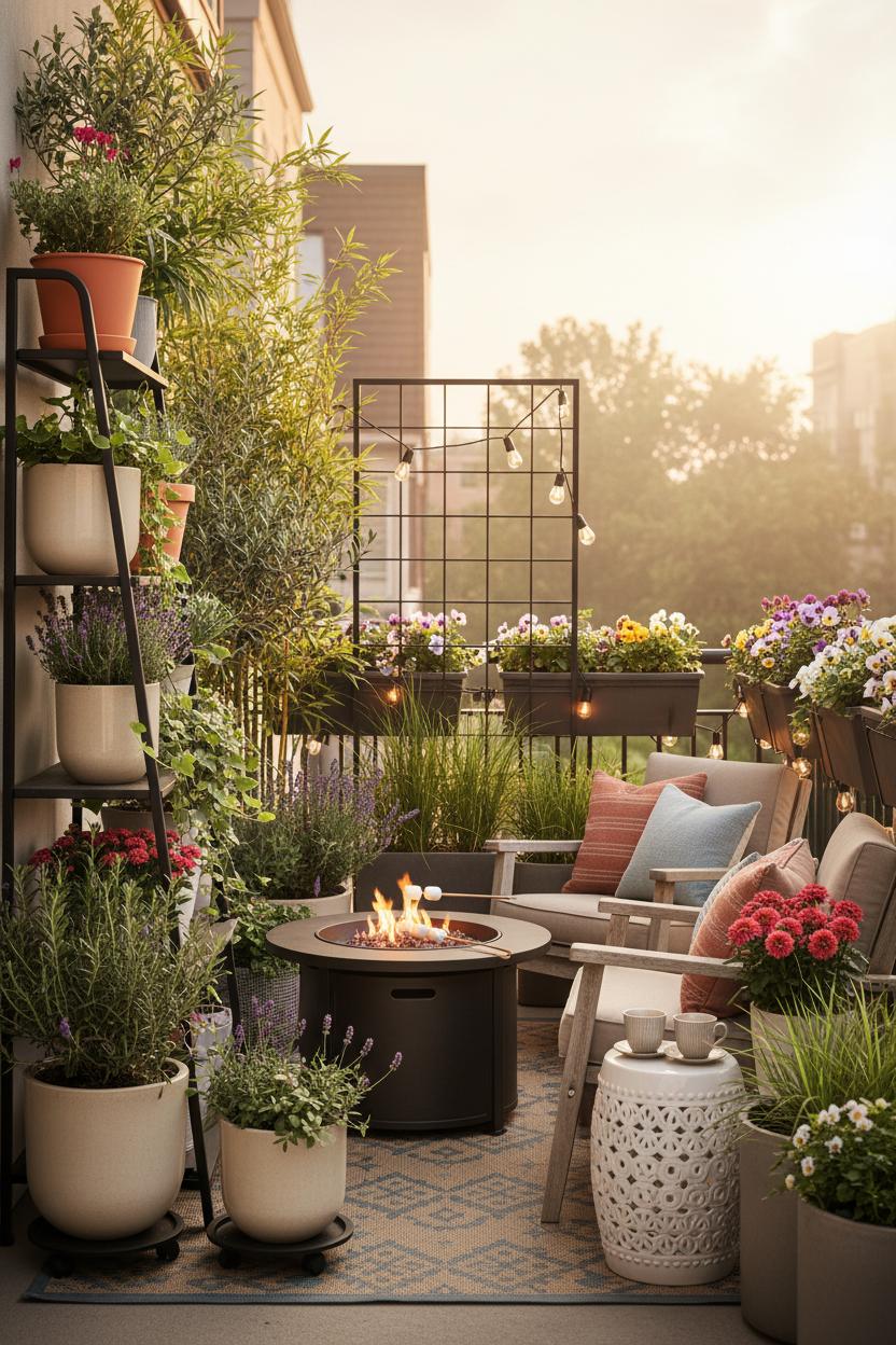 When the sun dips, add a tabletop fire pit for a flicker of warmth and a mesmerizing centerpiece that doubles as ambiance. If you have room to expand, angle the bistro chairs toward a nearby fire pit seating area so conversation flows between spaces, but if square footage is tight, let the table do double duty for dining and card games. Renter friendly decor tricks keep this setup flexible: use removable hooks for the string lights, a roll-up outdoor rug that stows easily, and lightweight folding patio chairs that can slide into a closet between gatherings. A narrow wall shelf or plant ladder can hold candles, small plates, and glassware without stealing floor space, while a lidded basket corrals napkins and blankets. Layer lanterns and solar stakes for depth, then finish with a tiny bud vase, cloth napkins, and a tray for drinks—suddenly you’ve created a destination, not just a corner. It’s the kind of nook that invites lingering, whether you’re sharing a late-night dessert under twinkling lights or taking a quiet, solo pause with tea and a good playlist—proof that thoughtful small patio design can deliver big on warmth and hospitality.