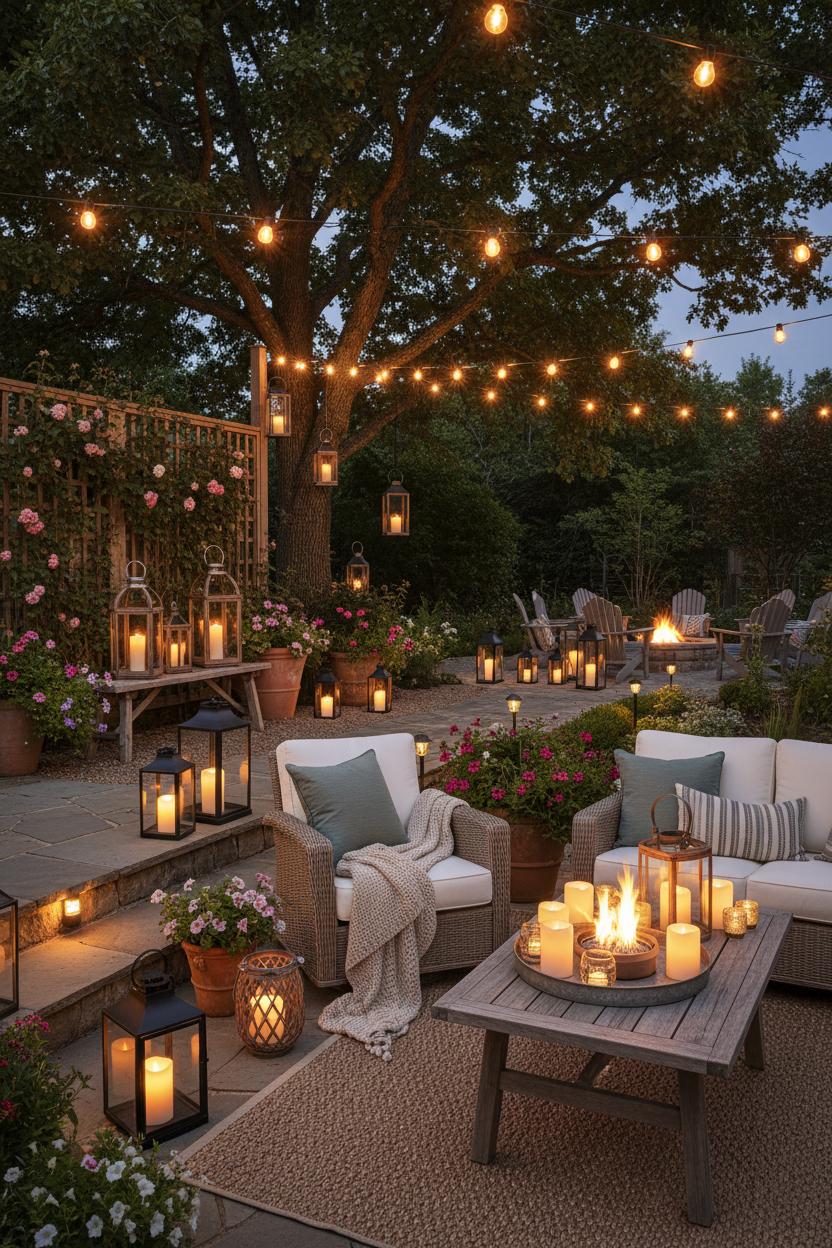 Style your seating as if you’re setting a table for a favorite friend. Cluster a couple of lanterns near your patio chairs, add a low tray with tea lights, and roll out an outdoor rug to anchor the scene. A tabletop fire pit brings that irresistible campfire flicker to a small space and pairs beautifully with plush, weatherproof throw pillows for snuggly, linger-longer vibes. If you’ve got fire pit seating already, let lanterns mark the path there and place a few around the perimeter so faces glow while the stars come out. I love slipping in citronella candles among the lanterns for a hint of bug control without sacrificing style. Keep the brightest fixtures for tasks and let the ambient glow do the rest—your garden will look layered, your plants will pop, and the whole setting will feel curated yet effortless. As far as cozy backyard ideas go, this one is the easiest to personalize: swap candle colors with the seasons, move lanterns around for parties, and let your solar lights guide guests home with a soft, twinkly trail.