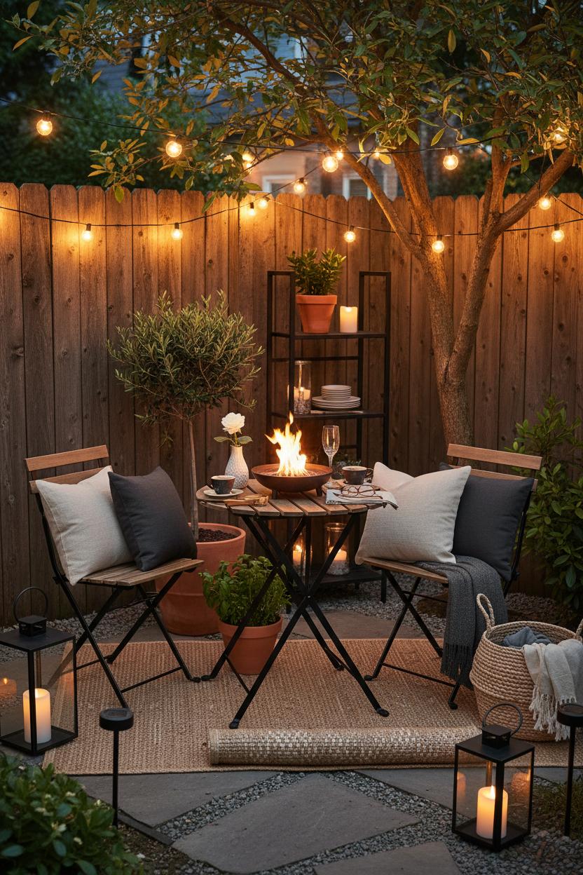 Think of a tiny bistro nook as the heart of your cozy backyard ideas—a little scene where morning espresso turns into twilight tapas with zero fuss. Start with a petite café table and two slim patio chairs tucked into a corner or along a fence line; anchoring the setup with an outdoor rug instantly defines the zone and adds texture underfoot. Layer in weatherproof throw pillows for comfort and a couple of potted herbs or a mini olive tree for that European sidewalk-café mood. For outdoor lighting, drape warm white string lights overhead or zigzag them from a fence to a tree; the glow softens hard lines, flatters everything it touches, and makes even a small patio design feel polished and intentional. Keep your palette cohesive—think natural woods, matte black metal, and soft linens—so the nook reads elevated rather than cluttered.