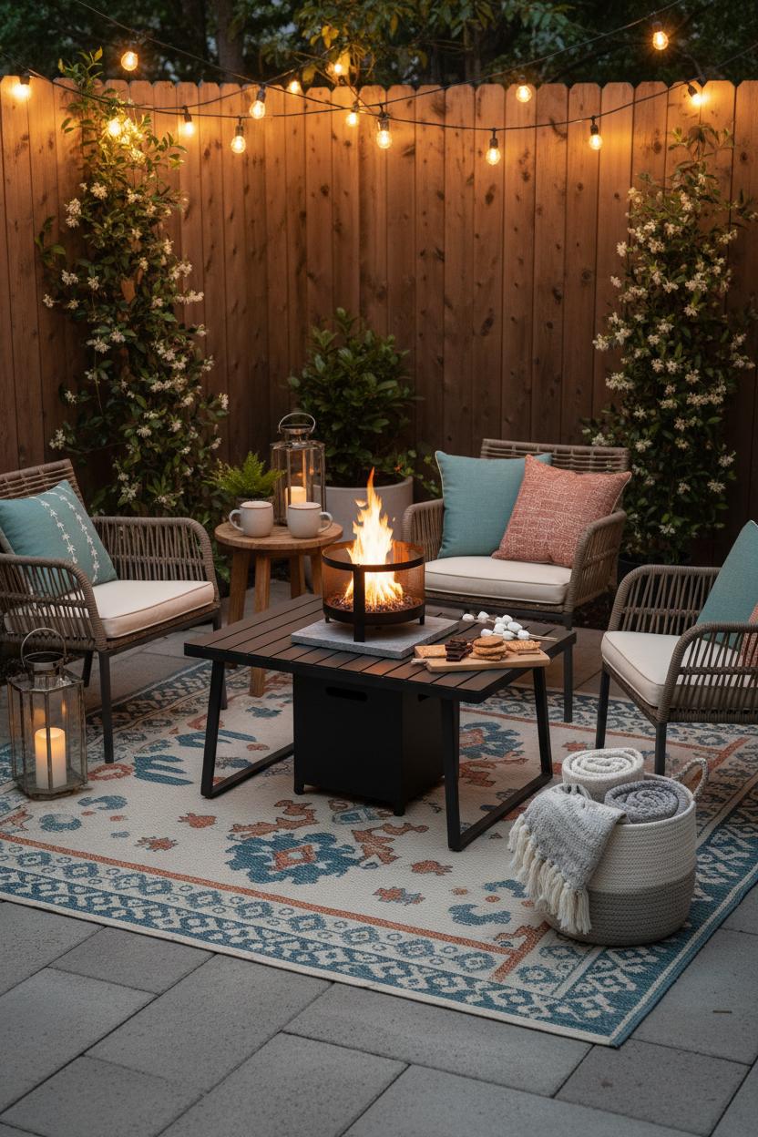 What makes this one of the easiest cozy backyard ideas is how flexible it is. Rearrangeable patio chairs let you shift the scene for two or for a crowd, the outdoor rug anchors it all, and the compact flame means you can keep pathways open and surfaces clutter-free. Swap pillow covers seasonally, change the rug pattern for a quick refresh, and tuck the tabletop fire pit away when not in use—no heavy lifting or permanent installs required. With the right outdoor lighting, layered seating, and a small but mighty flame, you’ll transform even the tiniest nook into a hangout that looks pulled from your favorite mood board and feels like a warm hug.