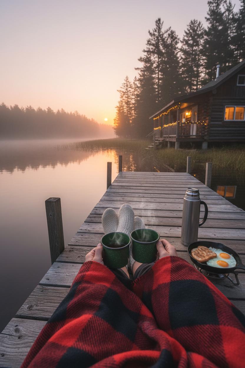 Picture a misty lake waking up with you, the sky blushing in pale pinks as loons call from the reeds and steam curls from enamel camp mugs cradled in both hands. You’re wrapped in a plaid blanket on the dock, toes tucked into wool socks, watching the sun lift over the pines while the cozy cabin behind you glows softly—last night’s LED string lights still twinkling around the porch railing. This is the kind of cabin getaway that slows your pulse and invites you to savor the quiet. If you’re gathering cabin trip ideas for fall travel, make this lakeside fishing theme your north star: a simple, soul-soothing weekend trip where the agenda is sunrise coffee, midday naps, and golden-hour casts. Keep breakfast easy—cast-iron cinnamon toast, a skillet of eggs, and a thermos top-off—and let the gentle lapping of the water set the pace for the day.