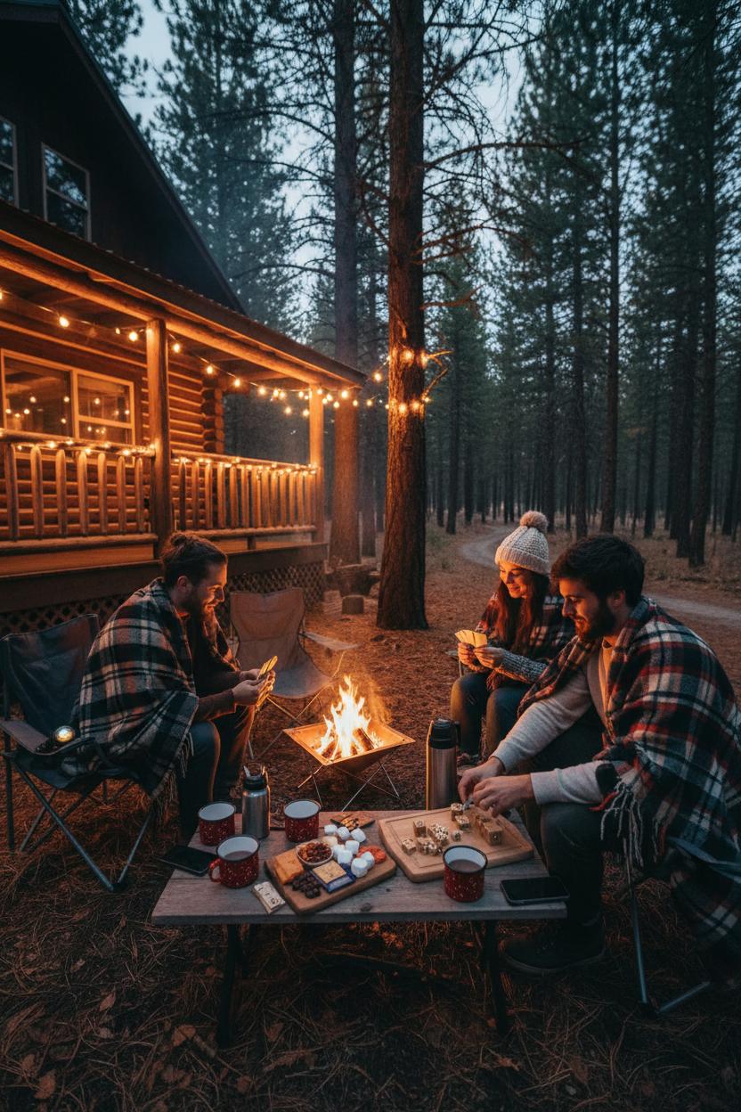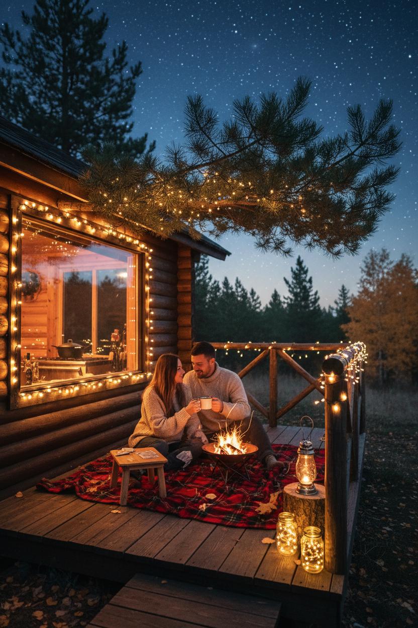 When you’re dreaming up cabin trip ideas that feel a little bit cinematic, nothing beats a romantic stargazing setup at your cozy cabin, lit by a halo of warm LED string lights. As the sky deepens to indigo, drape those lights along the porch railing, twine them around a pine branch, or frame the window so the inside glows like a lantern. Lay out a thick plaid blanket, pull on chunky knit sweaters, and fire up a portable fire pit for that gentle crackle and ember glow. Pour hot cider or cocoa into enamel camp mugs, clink cheers to your cabin getaway, and let the crickets set the soundtrack. If you’re planning a weekend trip, the magic is in the unhurried ritual: slow-cooked stew simmering inside, a deck of cards waiting on the table, and the soft hush of the forest wrapping around you like a promise.