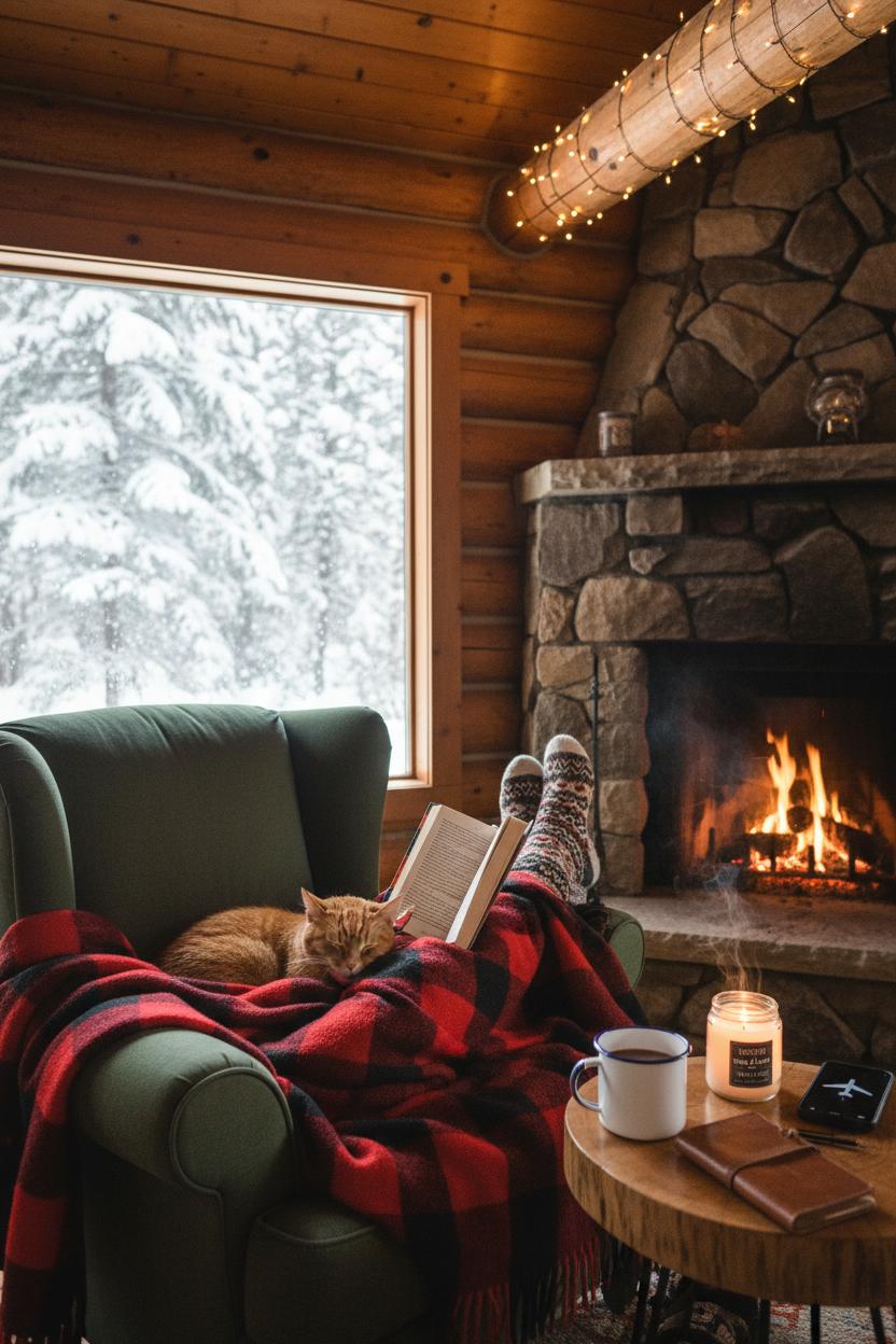 Imagine waking up to a hush so soft it feels like the world is holding its breath, snow dusting the pines outside your window while the fire hums low in the grate. This is the stay-in-and-savor chapter of your cabin trip ideas—the one where the stack of novels you’ve been saving finally gets its moment. Claim the coziest chair, drape a plush plaid blanket over your lap, and let the morning unfold slowly with cocoa in enamel camp mugs, steam curling like ribbon. Layer in the glow with LED string lights looped around a beam or headboard, add a candle that smells like cedar and clove, and you’ve created a little bookish sanctuary in your cozy cabin. Put your phone on airplane mode, jot down a few dreamy plans in a travel journal, and trade the to-do list for page-turners, sleepy cat naps, and the soft percussion of snowflakes tapping the window.