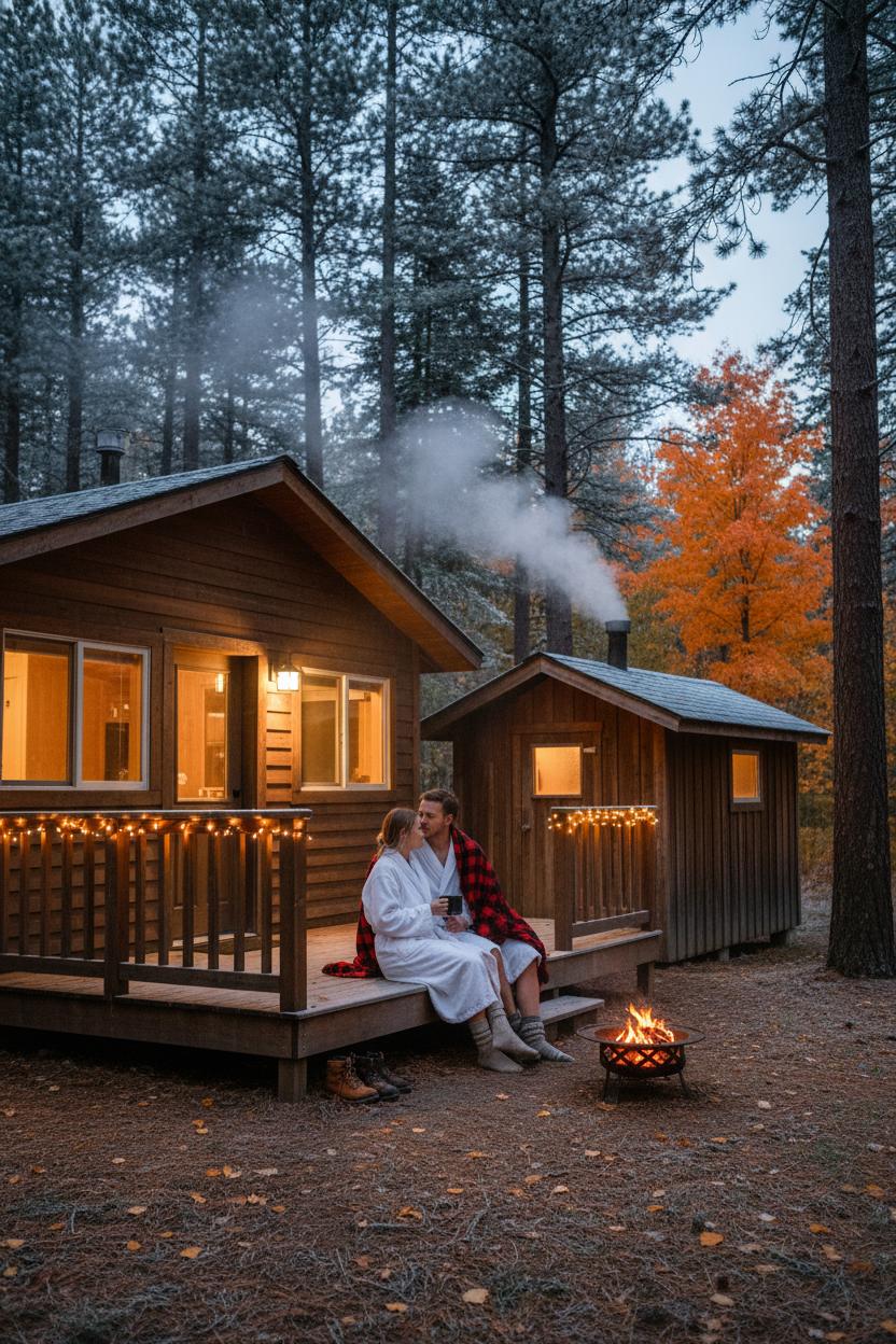 If your love language is slow mornings and sauna steam, make your next weekend trip a wellness retreat for two. Choose a cozy cabin with a cedar sauna tucked beside the pines, and plan to do less on purpose: a leisurely arrival, robes on, phones down. Let the heat and eucalyptus melt the week away while frost or drizzle kisses the windows, then step out for a brisk cool-down on the deck and breathe in that woodsmoke-laced air. This is one of those cabin trip ideas that feels restorative on every level—quiet, grounding, and endlessly romantic—especially during fall travel when the maples glow and the evenings arrive early. Keep dinner simple and sensory: a grazing board, a bubbling pot on the stove, music low, conversation softer still.