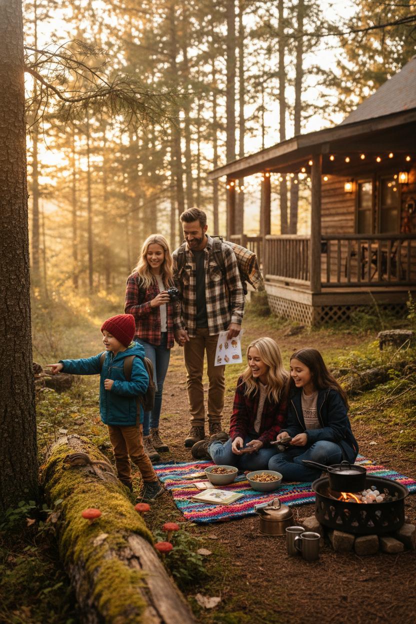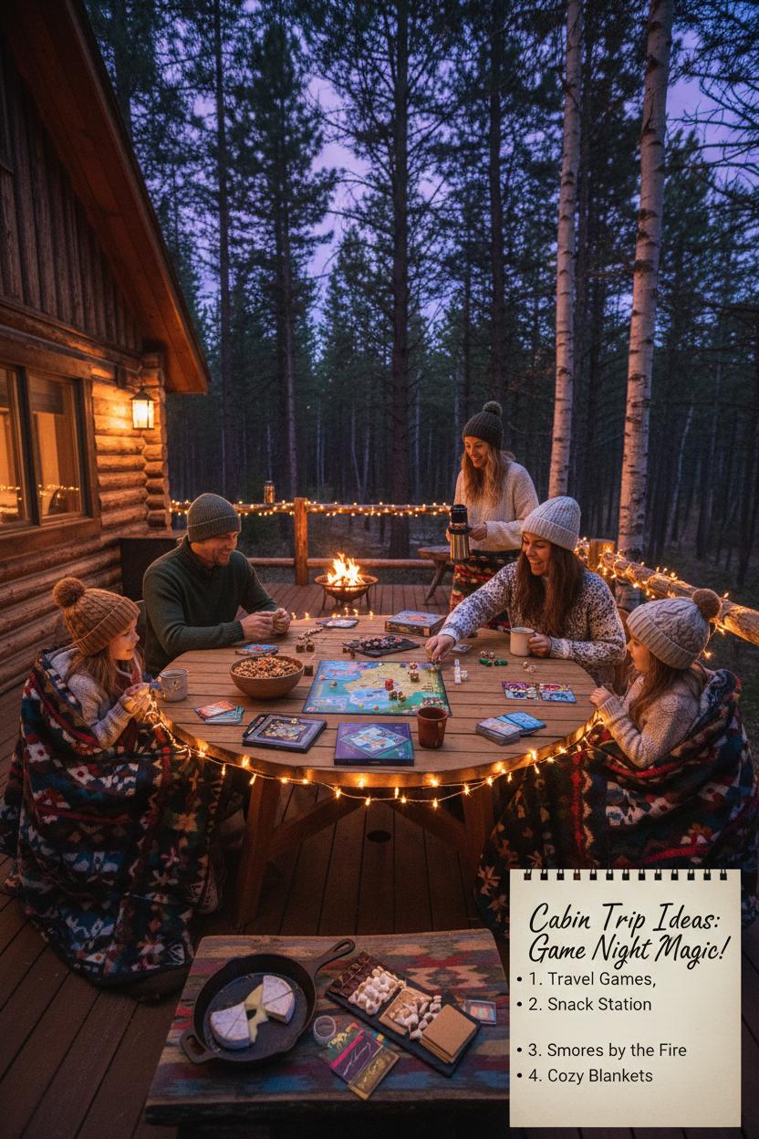 Twilight settles over the trees and suddenly the cabin feels like a little storybook hideaway—LED string lights glowing over the table, a cozy cabin blanket draped across laps, and a stack of travel board games ready to spark laughter long into the night. If you’re gathering cabin trip ideas that feel effortless and memorable, a game night in the woods is an instant classic. Keep a small arsenal of easy-to-pack favorites—dice and card games that play fast, a compact strategy game for the thinkers, a memory game for the littles—and you’ve got built-in fun whether you’re snowed in or listening to rain on the roof during your cozy cabin getaway.