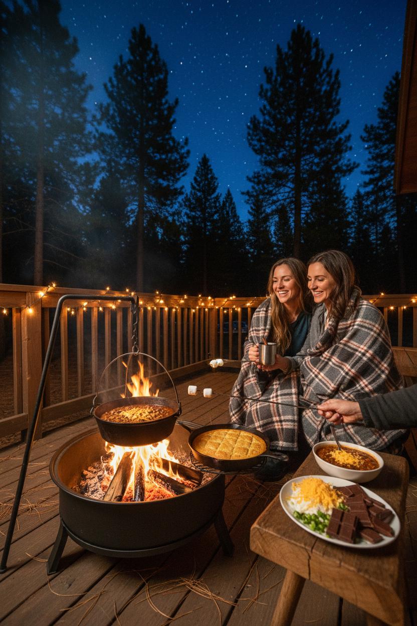 There’s something magical about a pot of chili bubbling away while the pines whisper overhead and the stars begin to blink awake. For a cozy cabin getaway, pack a sturdy set of campfire cookware and lean into the classics: a cast-iron skillet for cornbread and breakfast hash, a Dutch oven for slow-simmered chili, and a long-handled grate for toasting. If your rental doesn’t have a fire ring, a portable fire pit can transform the back deck into an instant outdoor kitchen. Spoon up bowls of chili piled with cheddar and green onions, pass around a skillet of butter-crusted cornbread, and keep mugs of cinnamon-kissed cocoa at the ready. Drape LED string lights along the porch railing for a soft glow while you cook, then wrap yourself in a cozy cabin blanket as the evening cools. This is one of those cabin trip ideas that works for everyone—simple, delicious, and oh-so-comforting.