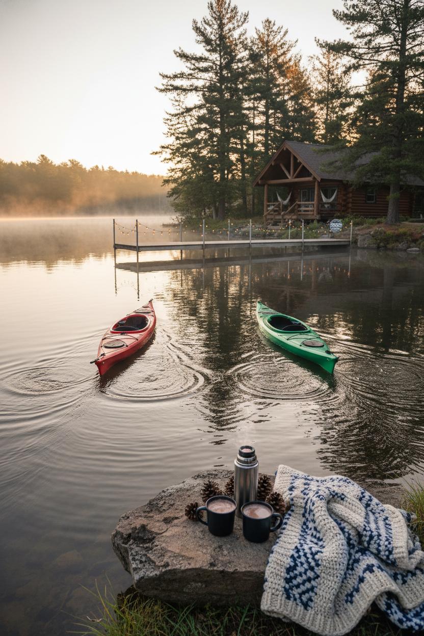 Picture a glassy lake at first light, steam rising from a thermos of hot cocoa, and two kayaks slicing across the mirror-smooth water. This is lakeside leisure at its dreamiest—slow, unhurried, and quietly thrilling. For a cozy cabin getaway, keep the mornings simple: paddle toward the mist, listen for loons, then drift back to the dock to wrap up in a cozy cabin blanket and watch the world wake up. String a few warm LED string lights along the railing for twilight ambiance, and let your phone live on airplane mode. The magic of this weekend cabin retreat isn’t in the checklist—it’s in the pauses between paddles, the shared mug of cocoa, the soft creak of a wooden dock.