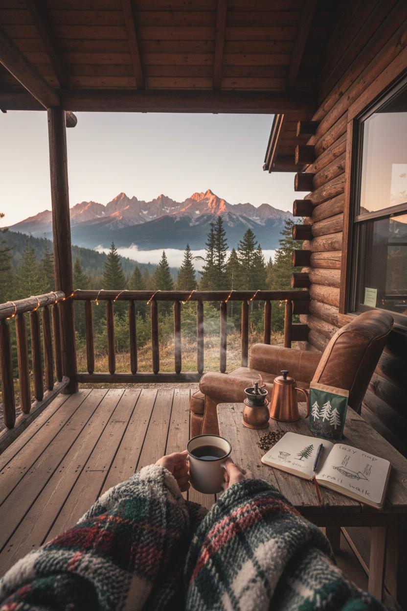 Steam curling from your mug, mountains blushing with first light, and the hush that only pines can keep—this is the moment that sets the tone for your cozy cabin getaway. Slip onto the porch wrapped in a cozy cabin blanket and let the day unfold slowly, one sip at a time. A weekend cabin retreat doesn’t have to be packed with plans; it can start with simple rituals that make you feel grounded. Bring your favorite beans, a hand grinder, and a tiny kettle, then savor the way coffee tastes different in crisp alpine air. While you watch the fog lift off the ridges, sketch out a few cabin trip ideas in your journal: a leisurely trail nearby, a lazy afternoon nap by the fireplace, or an early supper under the trees. Thread some LED string lights along the railing so your morning feels like a quiet celebration and your evening glows like a postcard.