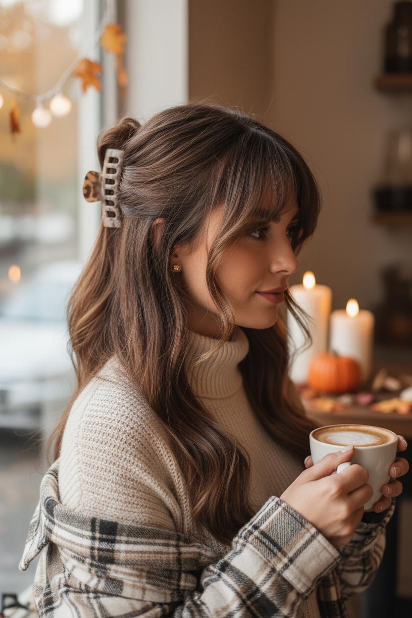This is one of those easy hairstyles that takes minutes yet looks thoughtfully styled, right at home among your favorite autumn hair ideas. It flatters second- or third-day hair, plays nice with curtain bangs, and pairs with everything from flannels to turtlenecks. Tuck it under a beanie, pull it out for an afternoon latte, and it still holds its shape thanks to that twist-and-clip backbone. Add stud earrings or a satin ribbon threaded through the clip for a little sparkle, and you’ve got a half-up halo that’s equal parts cozy and polished—proof that the best fall hairstyles are the ones you actually want to wear on repeat.