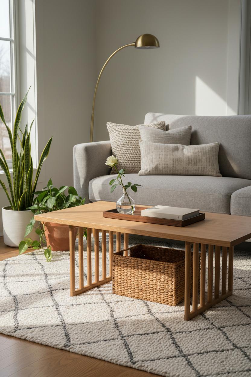 Style it like a pro by building gentle layers around it. Start with a textured area rug to ground the vignette and add depth underfoot; the nubby weave contrasts beautifully with sleek, open legs. On the sofa, mix neutral throw pillows in a couple of tactile fabrics so the palette feels calm but not flat. A slender brass floor lamp arcs in just the right touch of glow and glam, reflecting subtly off the oak and creating a cozy reading nook. Tuck a pair of indoor plant pots nearby—think sculptural greenery in simple clay or matte ceramic—to bring life and movement to your layout. On the tabletop, keep the edit tight: a low tray, a favorite book, and maybe a single bud vase. It’s one of those interior design ideas that proves restraint is your superpower when apartment decorating. The open base leaves room for a woven basket or two if you need hidden storage, yet the whole composition reads clean and intentional. With this kind of thoughtful edit, your light oak coffee table becomes a calm centerpiece that supports conversation, morning rituals, and movie nights—proof that in small spaces, the best pieces do less, look lighter, and make everything around them feel more considered.