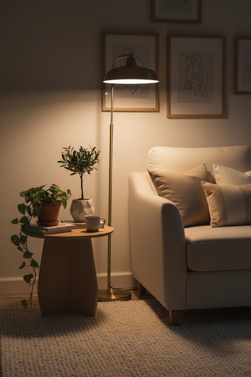 There’s a special kind of magic that happens when a slim brass floor lamp slips into a corner and washes the room in a soft, honeyed glow. In small space design, vertical elements are your secret advantage: that slender silhouette draws the eye upward, makes ceilings feel higher, and adds a refined shimmer that instantly reads as modern home decor without taking up precious square footage. Choose a lamp with a warm 2700–3000K LED and a dimmer so you can move from bright task light to cozy evening ambience with one touch; the brushed or satin finish keeps things elevated yet understated, perfect for minimalist decor where every piece has to work hard. Tuck the base behind a sofa arm or between a chair and the wall, let the shade hover just over your shoulder, and you’ve designed a reading nook that feels intentional, not improvised—one of those simple interior design ideas that quietly transforms the mood of a room.