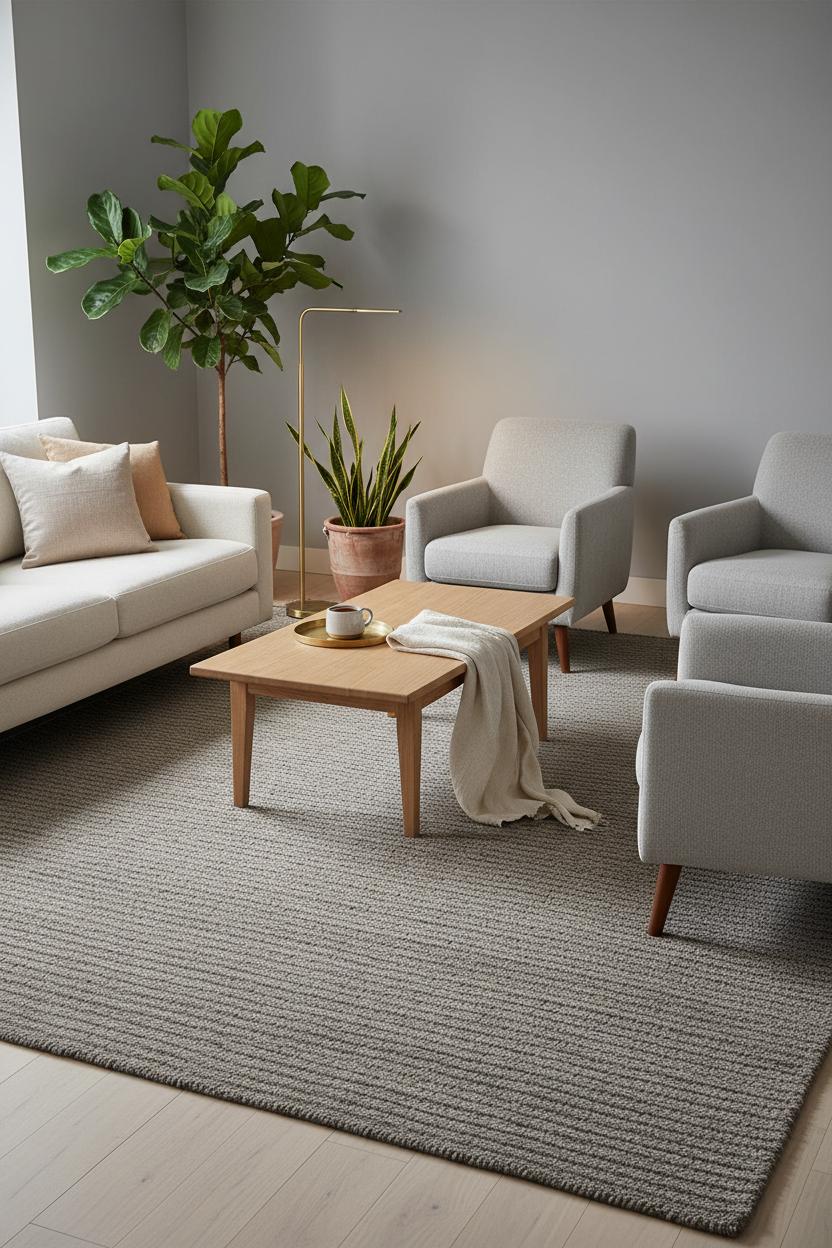 When your room is stripped back to the essentials, coziness starts from the ground up, and a textured area rug is the quickest way to soften the edges while quietly anchoring everything in place. In small space design, go larger than you think—letting the front legs of your sofa and chairs land on the rug visually expands the footprint and pulls the seating into one intentional zone. Choose tactile fibers that read calm but feel elevated: a wool loop pile with a subtle rib, a jute–cotton blend with heathered threads, or a tone-on-tone pattern that adds depth without shouting. Keep the palette hushed—oat, sand, mushroom, soft gray—and echo those hues with neutral throw pillows, a light oak coffee table, and a brass floor lamp for warm, evening glow. The mix feels collected yet effortless, the kind of modern home decor that looks as good on a Tuesday morning as it does when friends drop by. If you love a hint of life, tuck a couple of indoor plant pots nearby; the greenery plays beautifully against natural textures, and the whole scene reads like minimalist decor with heart.