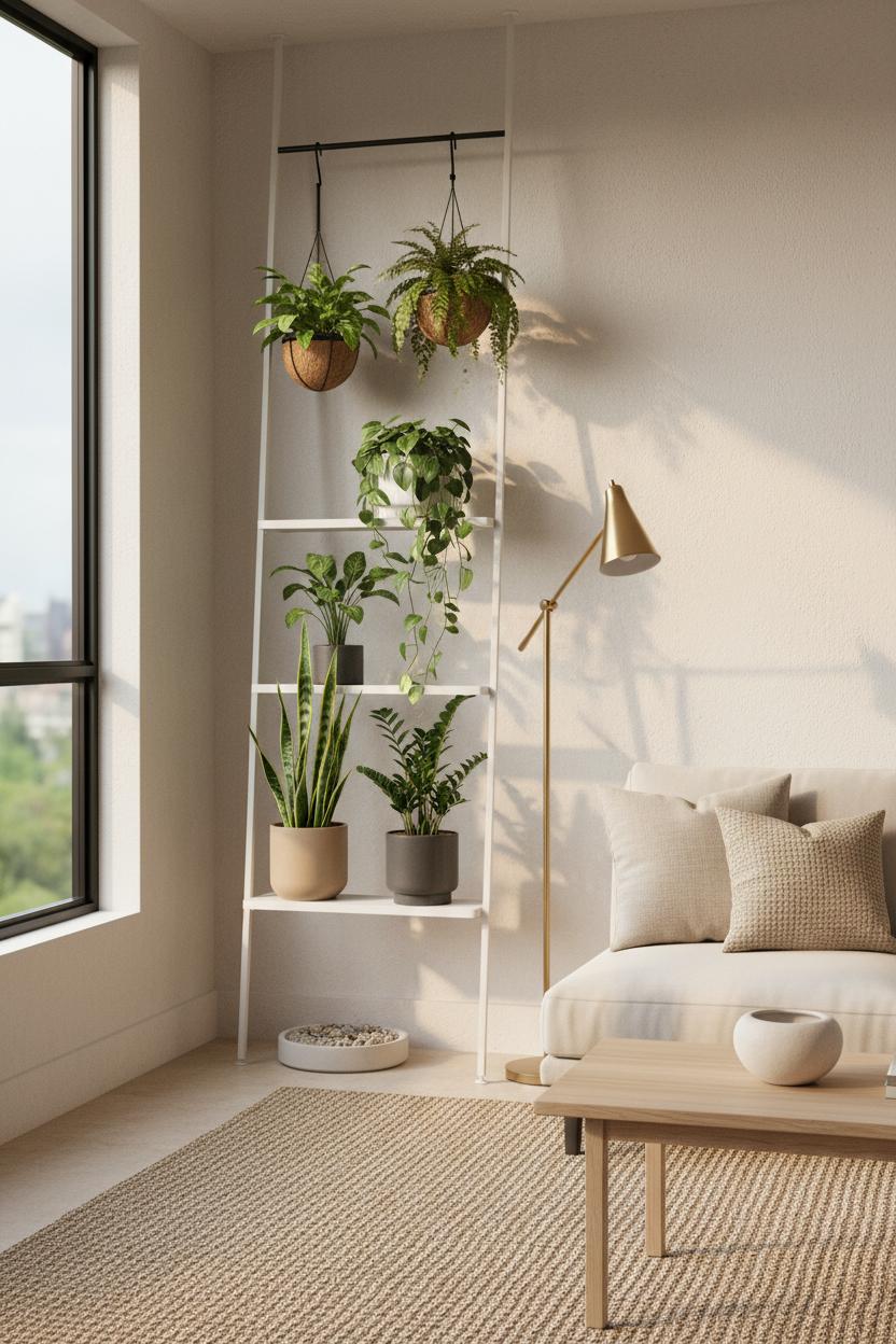 Place your vertical greenery near a window and let it frame your seating nook. A brass floor lamp casts a warm glow through the leaves at night, giving your living room a cozy, indoor-outdoor vibe that complements modern home decor. Anchor the scene with a textured area rug and a light oak coffee table topped with a single sculptural bowl; soften the sofa with neutral throw pillows so the eye rests on the foliage instead of clutter. If you’re apartment decorating, ceiling hooks or a simple tension rod can hold hanging indoor plant pots without drilling, and saucers or coco liners will keep moisture in check. Group plants by light and watering needs, tuck a small humidity tray on a lower shelf, and rotate the pots every few weeks for even growth. The beauty of vertical greenery is that it scales—add one more pot when you find a new favorite, or edit down for a cleaner line—while the whole display keeps the room feeling fresh, airy, and quietly alive. It’s a gentle reminder that minimal doesn’t have to mean sterile; it can mean thoughtfully layered, breathing, and beautifully simple.