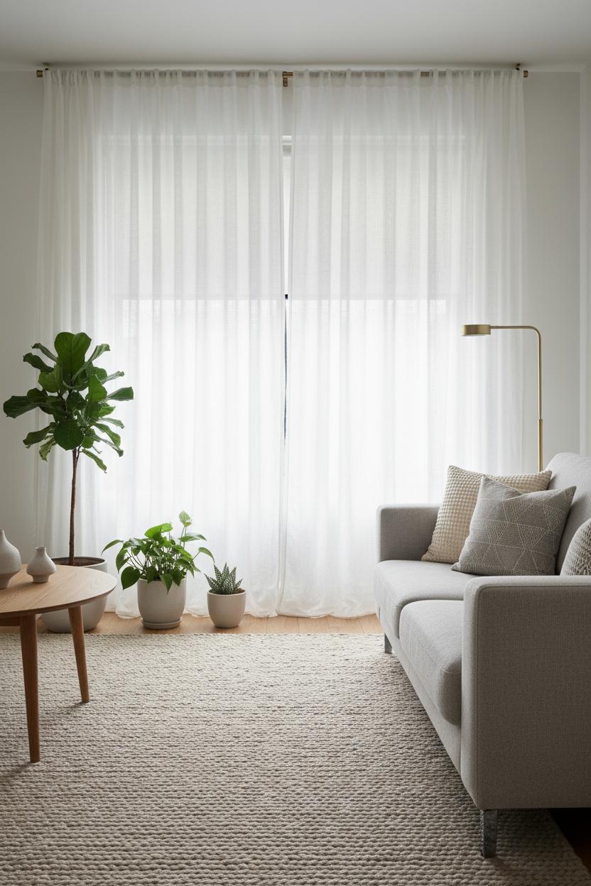 Airy layers: sheer curtains and a textured area rug for minimalist decor