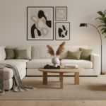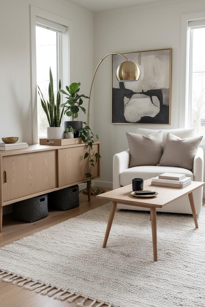 Build your vignette from the ground up. A textured area rug defines the zone and adds depth, then a light oak coffee table with airy legs keeps the room feeling open while offering a spot for a candle and a book stack. Toss in neutral throw pillows for a cozy hit without competing patterns, and then add one sculptural statement, like a brass floor lamp that arcs gracefully over the seating—functional and a little bit glamorous. Rather than a busy gallery wall, try one large-scale piece of art to draw the eye upward. Cluster indoor plant pots in varied heights on a single tray to bring life and softness without scattering greenery everywhere. The result is modern home decor that feels intentional, collected, and calming.