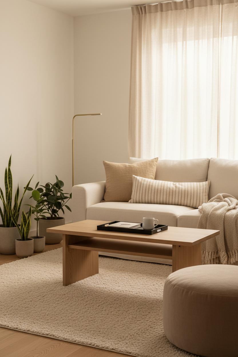 Now ground all that airiness with a textured area rug underfoot—the secret to cozy without clutter. A tone-on-tone weave, nubby wool flatweave, or soft jute blend adds depth you can feel without shouting for attention, and it anchors a seating zone in an open studio. Go large when you can: at least the front legs of your sofa should sit on the rug so the room reads as one collected space, not a scatter of pieces. Echo the rug’s tactile story with neutral throw pillows and a light oak coffee table that keeps the palette soft and the lines clean. A brass floor lamp brings a warm, evening glow that skims across the rug’s texture, while a trio of indoor plant pots by the window ties back to those breezy sheers. The effect is layered but light—exactly what apartment decorating needs to feel polished, purposeful, and uncluttered. With just sheers and a textured area rug, you’ve created a cozy foundation that supports everything else you love, proving that the best interior design ideas are often the simplest.