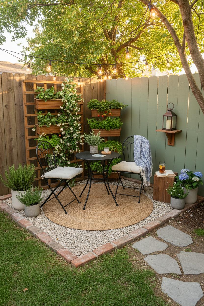 If you’re craving a quick backyard makeover without the splurge, start by defining zones, and let a compact seating nook be your anchor. Pick a sunny corner or the coziest slice of shade and carve it out with a budget-friendly base: a weatherproof outdoor rug, a square of pea gravel edged with bricks, or a couple of big stepping stones to visually “ground” the space. Add a petite bistro patio set—two chairs and a slim table instantly say “this is where we linger.” Behind it, create a living backdrop with vertical gardening to save floor space: a trellis planter for a climbing jasmine or sweet pea, paired with a vertical planter filled with cascading strawberries, basil, and mint. The layered greenery gives you privacy, texture, and that lush, tucked-away feeling, even in a tiny yard or balcony garden.