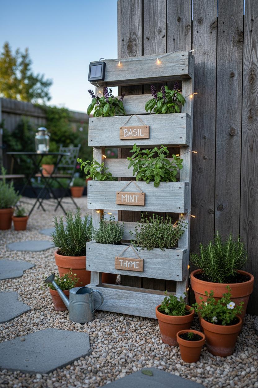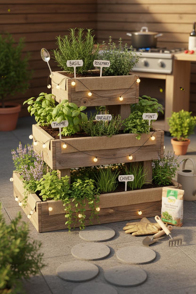 To make it feel like a mini destination, edge the area with a simple path poured using a stepping stone mold, then weave solar string lights around the frame so your herbs glow at dusk. This little corner becomes a nightly ritual: snip a sprig, inhale the scent, and watch fireflies while dinner bubbles. Maintenance is minimal—water regularly (lower tiers usually need less), pinch back flowers to keep leaves tender, and rotate the planter now and then for even growth. As far as backyard projects go, this one is a win: it’s edible, beautiful, and endlessly customizable. Whether you build from pallet wood or pop a pre-made herb planter on the patio, this tiered setup elevates your outdoor decor while putting fresh flavor right at your fingertips.